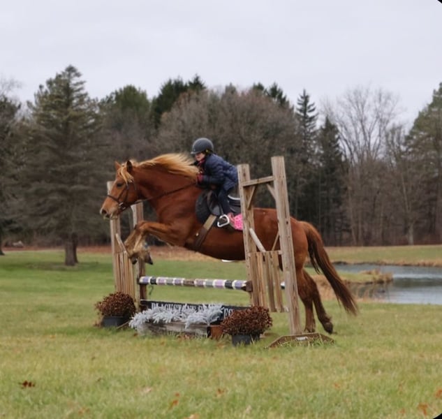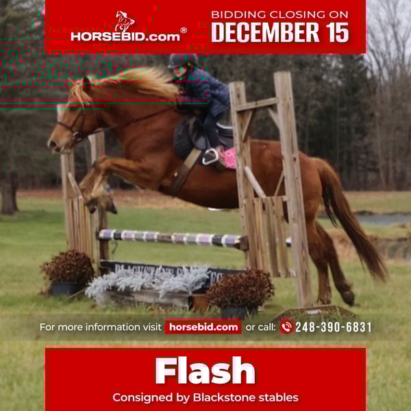 🎄𝐓𝐇𝐄 𝑯𝒐𝒍𝒊𝒅𝒂𝒚 𝐂𝐋𝐀𝐒𝐒𝐈𝐂🎄 Happening now thru MONDAY | DECEMBER 15th - Available EXCLUSIVELY on HorseBid's website! For more details and to register visit: www.Horsebid.com CONSIGNOR CONTACT: Blackstone stables 248-390-6831 LOCATION: Howell MI BREED: Quarter Horse Haflinger Cross REGISTERED: No COLOR: Chestnut HEIGHT: 14.2 AGE: 7 GENDER: Gelding Mr. Dependable—better known as Flash around here—is a 7-year-old, 14.2hh Quarter Horse/Haflinger cross gelding with the most stunning, double-thick flaxen mane you’ve ever seen. Flash is truly the kindest soul around. He’ll let anyone catch him anywhere, anytime, and he stands tied quietly for everything from grooming to mounting. Flash has miles and miles of trail experience under his belt. He’s been through woods and open fields, seen wildlife, crossed lakes and streams, gone over bridges, and handled every kind of terrain with confidence. He’s the type you can safely load up and take on any adventure. He enjoys taking his time and soaking in the scenery, but he’ll move out willingly when asked. He has been exposed to pool noodles, tarps, and all sorts of desensitization tools—he’s simply not one to bat an eye at anything. In the arena, Flash is just as dependable. He walks, trots, canters, and jumps around with even the most beginner riders. He’ll pack a tiny kid or help an adult work on refining their skills. Flash will jump full courses both indoors and out, holding a lovely, steady canter throughout. He could be the perfect horse for a little girl learning to jump or a more advanced rider looking to move up. Flash is the rare combination of safe, sturdy, willing, and beautifully trained. Whether you’re looking for a trustworthy babysitter, a fun partner on the trails, or a confidence-building mount in the arena, Flash is the kind of gelding that makes every ride feel easy. Horses like him are few and far between—he is truly the whole package.