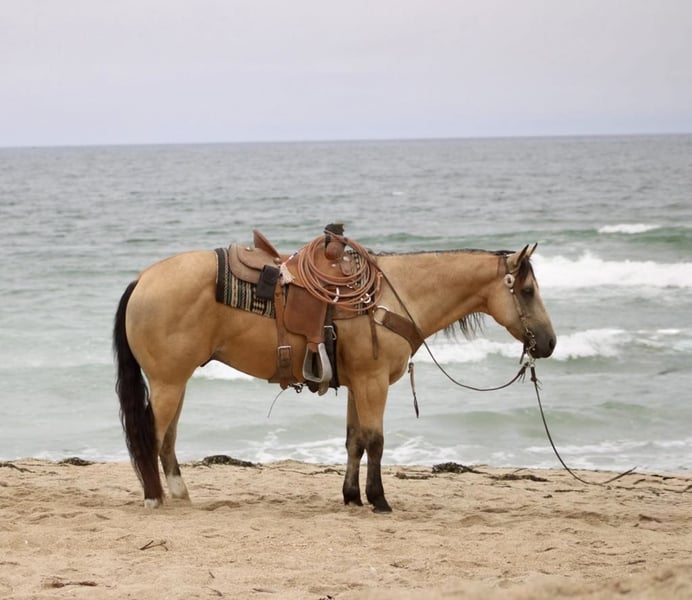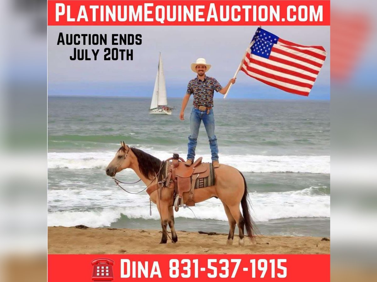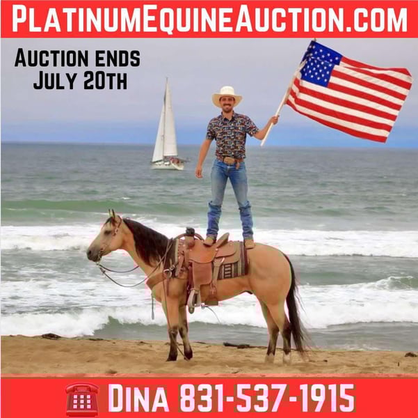 ONLINE AUCTION Place your bids at www.PlatinumEquineAuction.com Starting Bid $3500 Auction ends July 20th 2025 Need a new saddle? Check out White Rock Saddles on our website or Facebook 24k-Mr Gold Nugget is the Ultimate Buckskin Dream Horse! Meet 24k-Mr Gold Nugget a stunning, drop-dead gorgeous buckskin 7 years old and 14.3 hands tall this gelding checks all the boxes: safe, reliable, calm, and absolutely cool. He’s as trustworthy as they come and one of the easiest horses to ride. Quiet and level-headed, this gentle soul has the kind of disposition that makes him a perfect family favorite, yet he’s versatile and athletic enough to tackle any challenge you throw his way. Whether you’re hitting the trails or stepping into the arena, 24k-Nugget is always ready. He confidently navigates brush, logs, and deep creek crossings. He’s been used for roping, doctoring, and branding cattle, making him an awesome ranch partner. He has the potential to excel in the roping pen—whether as a breakaway or heel horse. This gelding is a smooth mover with beautiful circles, a soft stop, and an easy back-up. He’s well-exposed and unbothered by the unexpected—he’s seen bridges, tires, pool noodles, and more. He’s been to town, and couldn’t care less about honking horns, buzzing traffic, or semis. We’ve even taken him to the beach—he loves the waves and the feeling of sand in his hair! 24k- Nugget is the kind of horse people dream of owning. He’s confident riding out alone or in a group, handles time off like a pro, and is a joy to groom, clip, and tack up. He hauls like a champ, settles in anywhere, and ties quietly for overnight camping trips. This is the horse you’ll be proud to own—safe, stunning, and ready to make countless memories with you. Located in Paicines, CA. Contact Dina at Longhorn Ranch 831-537-1915 to meet this handsome buckskin! ONLINE AUCTION Place your bids at www.PlatinumEquineAuction.com Starting Bid $3500 Auction ends July 20th 2025 Need a new saddle? Check out White Rock Saddles on our website or Facebook
