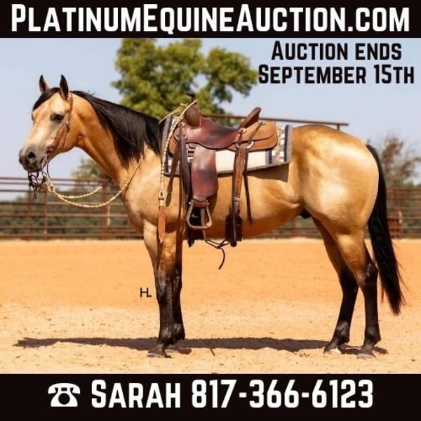 ONLINE AUCTION Place your bids at www.PlatinumEquineAuction.com Starting Bid $3500 Auction ends September 15th, 2024 Need a new saddle? Check out White Rock Saddles on our website or Facebook! Cartels Gunsmoke is a 6yr old, 14.3hh, AQHA registered gelding, “Kodak”, as he is affectionately known, is our little golden boy. Everywhere he’s gone he’s gotten compliments, not only his looks but his demeanor as well, and no matter the job you task him with he’s going to try his hardest to do and be the best; whether that’s doing work from sun up to sun down on the ranch, hitting the show pen in ranch versatility classes, packing toddler and youth riders around, or going for a trail ride. Kodak is no stranger to a hard days work and has been used in all aspects of ranch work. Most recent on his ranching resume, he was the main mount used on a 70,000 acre ranch in New Mexico where he gathered, sorted, doctored, branded, and loaded trucks. Where he was at in New Mexico is considered the high desert. If you’re unfamiliar with what the high desert entails, it is a vast and rocky environment which helped contribute to Kodak’s sure footedness. He will go all day for ranch work and has an extremely comfortable trot to set out at to check fence. Besides being used for ranch work outside, Kodak also has experience exploring state parks and trails where he will walk out on a loose rein alone or in a group and is a happy camper no matter how long or short of a trail ride you’d like to have. In the arena, Kodak is also a joy to ride. He’s smooth and fluid in all gaits and transitions and stays soft and supple in your hand. He has an easy turn around, can pick up both his leads from a walk, and will come right down to a slower gait or stop by a simple lift of your hand and some seat pressure. He’s easy to get along with in the saddle, has packed around inexperienced kids including our 3yr old son whom Kodak has been helping teach how to ride, and is a happy medium between “whoa” and “go” as he’ll go the pace that’s asked of him. Recently Kodak has dived into the show world of ranch versatility and has shown he has real potential to be a star in it with a few more shows under his belt. He does all maneuvers needed for trail (opening/closing gates, dragging logs, bridges, backing Ls, log jumps, water crossings, etc.), is pleasant in a cramped rail class, has a beautiful extended trot for your pleasure and ranch riding classes, has a solid foundation laid for the reining, and has a ton of natural cow sense for your cow work classes. He won’t be your open division winner, but Kodak is absolutely a mount a Non-Pro/Amateur/Youth could enjoy, show, and be successful with. On the ground, Kodak is as pleasant as a horse could get. He stands for absolutely everything like a gentleman, loves being doted on, is easy to catch, gets a long with others in a herd well, stalls with no issues, and is gentle enough that I have no second thoughts when it comes to my 3yr old son playing around Kodak or handling Kodak by himself. Kodak is UTD on all care from teeth to vet work and has a recent health exam on file including x-rays of his front feet and hocks with no remarkable findings. He requires no maintenance and has no bad habits or vices. Kodak has a personality as golden as the color of his coat and we absolutely love and adore him in every way. Being as phenomenal as he is at just 6yrs of age, the sky truly is the limit when it comes to the possibilities with this gelding. Whether you want a solid horse to use on your ranch, your next up and coming show horse, or a horse that the whole family can enjoy… Kodak can fill the position! H Spur Performance & Versatility Horses invites you to come meet Kodak in Weatherford, Tx and we can help assist setting up hauling nationwide. For any questions or to talk about if Kodak is the right fit for you, please contact Sarah at 817-366-6123. To watch all of Kodiak’s available videos in their entirety as well as view his health exam and additional pictures, please visit www.hspurhorses.com/cartelsgunsmoke ONLINE AUCTION Place your bids at www.PlatinumEquineAuction.com Starting Bid $3500 Auction ends September 15th, 2024 Need a new saddle? Check out White Rock Saddles on our website or Facebook!