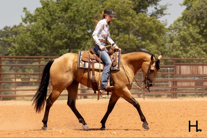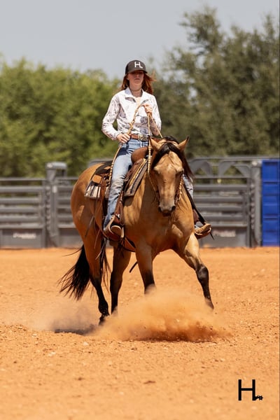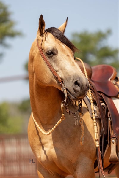 ONLINE AUCTION Place your bids at www.PlatinumEquineAuction.com Starting Bid $3500 Auction ends September 15th, 2024 Need a new saddle? Check out White Rock Saddles on our website or Facebook! Cartels Gunsmoke is a 6yr old, 14.3hh, AQHA registered gelding, “Kodak”, as he is affectionately known, is our little golden boy. Everywhere he’s gone he’s gotten compliments, not only his looks but his demeanor as well, and no matter the job you task him with he’s going to try his hardest to do and be the best; whether that’s doing work from sun up to sun down on the ranch, hitting the show pen in ranch versatility classes, packing toddler and youth riders around, or going for a trail ride. Kodak is no stranger to a hard days work and has been used in all aspects of ranch work. Most recent on his ranching resume, he was the main mount used on a 70,000 acre ranch in New Mexico where he gathered, sorted, doctored, branded, and loaded trucks. Where he was at in New Mexico is considered the high desert. If you’re unfamiliar with what the high desert entails, it is a vast and rocky environment which helped contribute to Kodak’s sure footedness. He will go all day for ranch work and has an extremely comfortable trot to set out at to check fence. Besides being used for ranch work outside, Kodak also has experience exploring state parks and trails where he will walk out on a loose rein alone or in a group and is a happy camper no matter how long or short of a trail ride you’d like to have. In the arena, Kodak is also a joy to ride. He’s smooth and fluid in all gaits and transitions and stays soft and supple in your hand. He has an easy turn around, can pick up both his leads from a walk, and will come right down to a slower gait or stop by a simple lift of your hand and some seat pressure. He’s easy to get along with in the saddle, has packed around inexperienced kids including our 3yr old son whom Kodak has been helping teach how to ride, and is a happy medium between “whoa” and “go” as he’ll go the pace that’s asked of him. Recently Kodak has dived into the show world of ranch versatility and has shown he has real potential to be a star in it with a few more shows under his belt. He does all maneuvers needed for trail (opening/closing gates, dragging logs, bridges, backing Ls, log jumps, water crossings, etc.), is pleasant in a cramped rail class, has a beautiful extended trot for your pleasure and ranch riding classes, has a solid foundation laid for the reining, and has a ton of natural cow sense for your cow work classes. He won’t be your open division winner, but Kodak is absolutely a mount a Non-Pro/Amateur/Youth could enjoy, show, and be successful with. On the ground, Kodak is as pleasant as a horse could get. He stands for absolutely everything like a gentleman, loves being doted on, is easy to catch, gets a long with others in a herd well, stalls with no issues, and is gentle enough that I have no second thoughts when it comes to my 3yr old son playing around Kodak or handling Kodak by himself. Kodak is UTD on all care from teeth to vet work and has a recent health exam on file including x-rays of his front feet and hocks with no remarkable findings. He requires no maintenance and has no bad habits or vices. Kodak has a personality as golden as the color of his coat and we absolutely love and adore him in every way. Being as phenomenal as he is at just 6yrs of age, the sky truly is the limit when it comes to the possibilities with this gelding. Whether you want a solid horse to use on your ranch, your next up and coming show horse, or a horse that the whole family can enjoy… Kodak can fill the position! H Spur Performance & Versatility Horses invites you to come meet Kodak in Weatherford, Tx and we can help assist setting up hauling nationwide. For any questions or to talk about if Kodak is the right fit for you, please contact Sarah at 817-366-6123. To watch all of Kodiak’s available videos in their entirety as well as view his health exam and additional pictures, please visit www.hspurhorses.com/cartelsgunsmoke ONLINE AUCTION Place your bids at www.PlatinumEquineAuction.com Starting Bid $3500 Auction ends September 15th, 2024 Need a new saddle? Check out White Rock Saddles on our website or Facebook!