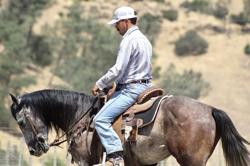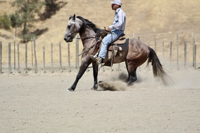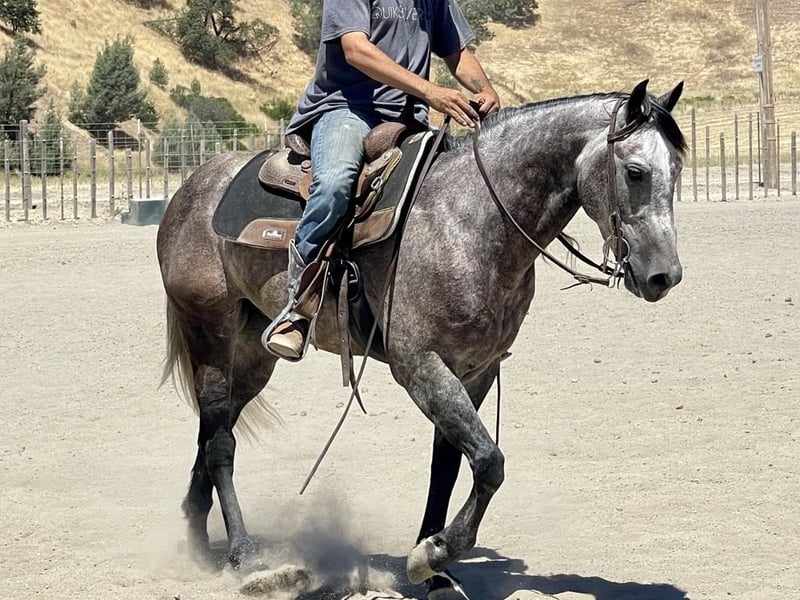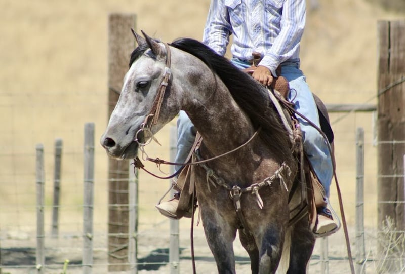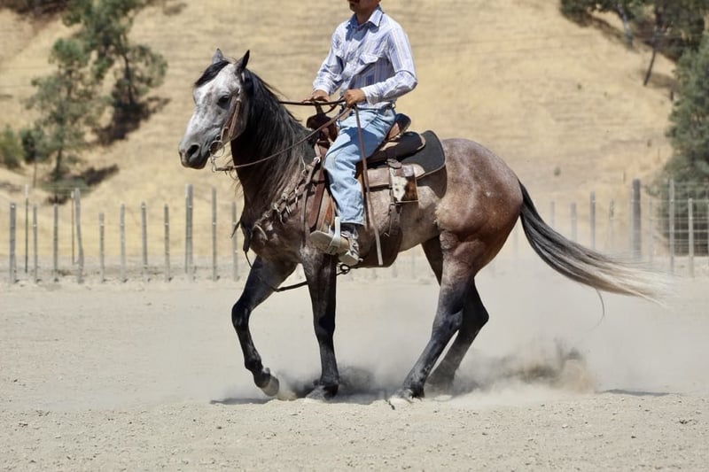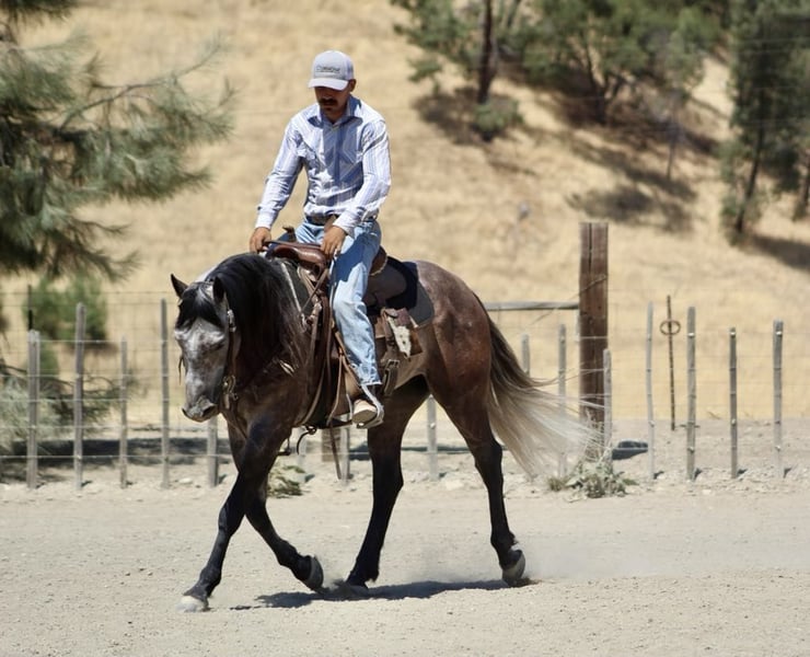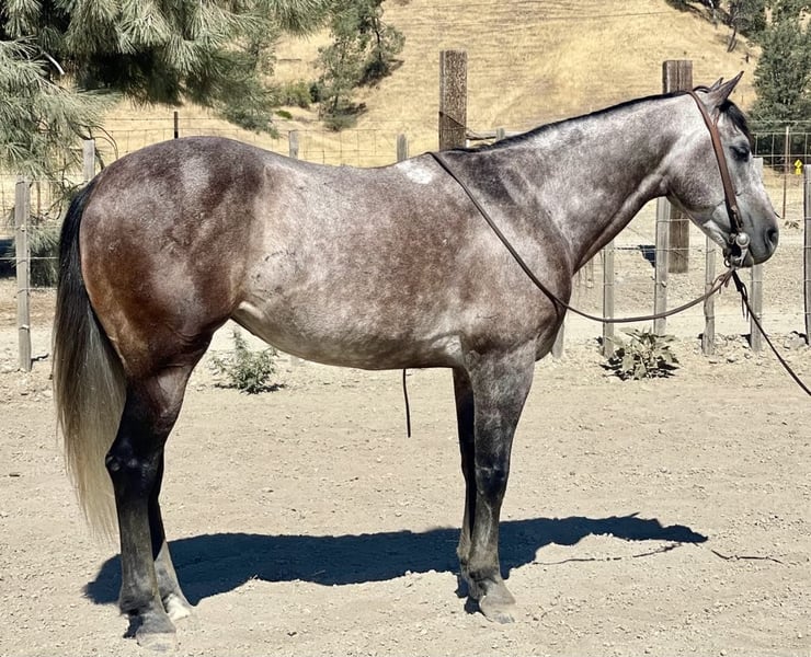 ONLINE AUCTION Place your bids at www.PlatinumEquineAuction.com Starting Bid $3500 Auction ends July 28th, 2024 Need a new saddle? Check out White Rock Saddles on our website or Facebook! Armani is a steel grey charming guy is beautiful with his long black mane and tail. Armani is ready to do anything you could dream of and has the kind gentle demeanor to go along with it. Armani stands 14.3 hands and just 6 years old. He has been started fundamentally correct, and rode all over to see many sights and proved to be a solid minded horse. He has been used regularly on the ranch and will be a certified ranch horse! Armani is extremely gentle, quiet to be around and loves people. He is a very straightforward uncomplicated ride. This is the kind of horse that can be ridden daily, weekly, or monthly and still be the same horse every time you swing your leg over. The great part about this gelding is not only does he have extensive trail experience, but he’ll also ride around the arena wonderfully. He yields to leg pressure, has a soft feel to him and rounds out nicely. Armani picks up his leads effortlessly with easy gentle cues. He also has a sliding stop, backs up collected and mostly anyone who can sit up on a horse can ride! He stands still for mounting and dismounting, is willing to please in every way. This is a true western broke horse. You don’t have to be a cowboy to ride him, but he’ll certainly make you look like one. Armani is a really nice mover and has very comfortable gaits. Has a nice soft mouth and is very supple. Armani has the best personality and everyone who meets him loves him. He has been used out on the ranch, and is a natural “cowy” horse. He has gathered, branded, and doctored cattle. He has also been started on the heel side and has really taken to it with ease has roped live cattle and the lead steer. He really has what it takes to make a nice heel horse. He is unbothered out on the chaotic trails and is very comfortable around all types of wildlife. He will go where he is asked, without any refusal. Armani is non reactive to tarps, ball, and flags.He has seen the trail obstacles and is very willing. He has been to town and will Ride quietly alongside traffic, barking dogs, semis, and cross overpasses like a confident soldier. He has been taken to local shows to see the sights and handled it amazingly didn’t mind the cheering crowds, loudspeaker, Rough stock events or the booming clown act. Armani is great for the farrier and clips, bathes, and ties great. Armani has a bright future ahead of him and literally go in so many directions the sky is the limit with this one. Please feel free to come meet him before the auction ends or call with any questions you may have about this handsome boy. Located in Paicines, CA. For more info contact Longhorn Ranch Dina 831-537-1915. ONLINE AUCTION Place your bids at www.PlatinumEquineAuction.com Starting Bid $3500 Auction ends July 28th, 2024 Need a new saddle? Check out White Rock Saddles on our website or Facebook!