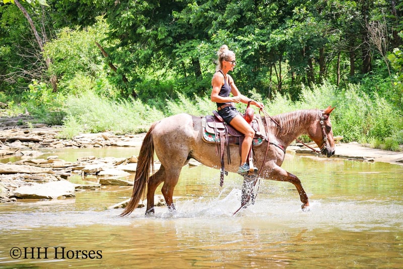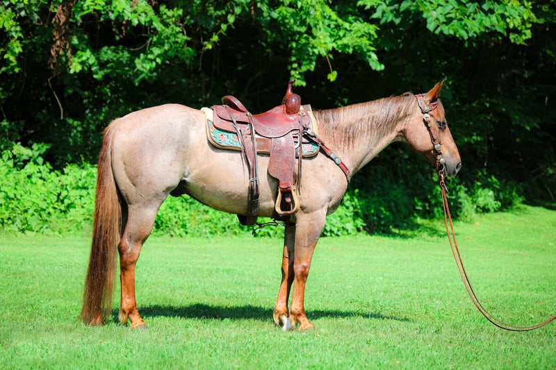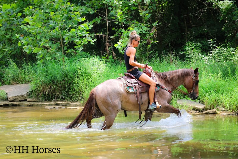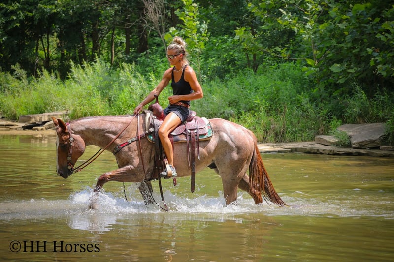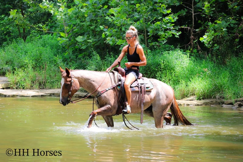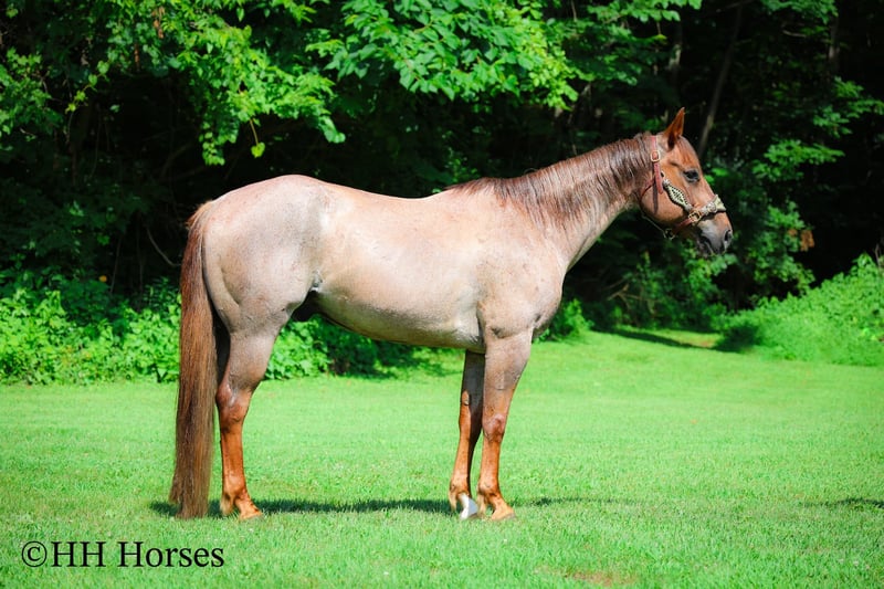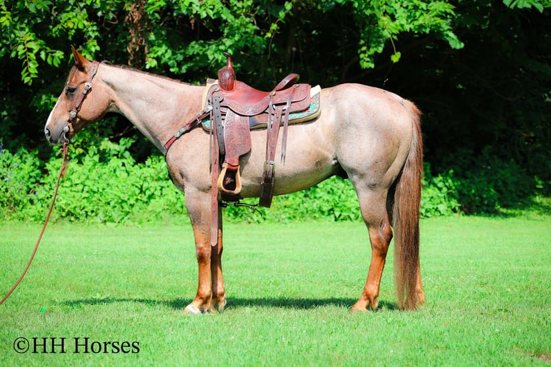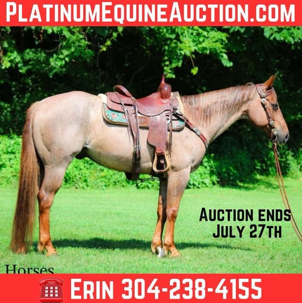 ONLINE AUCTION Place your bids at www.PlatinumEquineAuction.com Starting Bid $3500 Auction ends July 27th 2025 Need a new saddle? Check out White Rock Saddles on our website or Facebook This is “CARROT CAKE”, a top notch broke, gentle, well mannered, versatile RED ROAN QUARTER HORSE GELDING that the whole family can ride and that you can take out and do the ranch work with. He is 14.3 hands tall and 7 years old. This gelding is the kind of horse that makes you LOVE TO RIDE. He is obedient, calm, cool, collected, and civilized. He lopes the NICEST circles without the confines of an arena fence. He has a smooth, low headed, and relaxed jog. He is a seasoned ranch mount that has been ridden by older people, younger children, and novice riders. He can also step it up notch and really ride around when asked to do so. He will slide stop, back up, move off of leg cues. He is the nicest horse to get alone with, he aims to please, and he likes attention. He will cross water, trail ride anywhere you want to go, and he has been on the main roads. He is attractive, super smart, well broke, and will one hand neck rein around nicely. He’s my favorite horse that I have had in a long time. For more info, to schedule a time to come see him or to make a Buy It now Offer, call Erin with HH Horses 304-238-4155 Located in Flemingsburg, KY. ONLINE AUCTION Place your bids at www.PlatinumEquineAuction.com Starting Bid $3500 Auction ends July 27th 2025 Need a new saddle? Check out White Rock Saddles on our website or Facebook