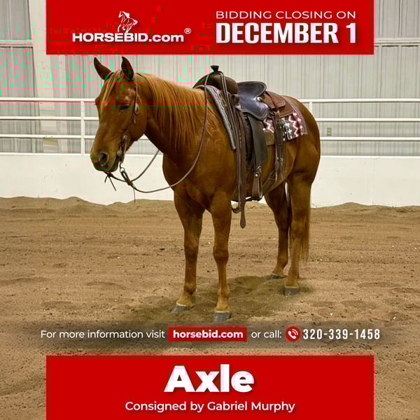 ⚜️ 𝓽𝓱𝓮 𝐇𝐨𝐫𝐬𝐞𝐦𝐚𝐧'𝐬 𝓢𝓱𝓸𝔀𝓬𝓪𝓼𝓮⚜️ Happening now thru MONDAY | DECEMBER 1st - Available EXCLUSIVELY on HorseBid's website! For more details and to register visit: www.Horsebid.com CONSIGNOR CONTACT: Gabriel Murphy 320-339-1458 LOCATION: Cannon falls, mn BREED: Qaurter horse REGISTERED: No COLOR: Sorrel HEIGHT: 15 hh AGE: 7 GENDER: Gelding Here’s a gem you won’t want to miss: a stunning sorrel gelding built to last. Standing at 15 hands high, he boasts broad hips and a sturdy build, thanks to his impressive horn. Axle is exceptionally well-bred, gentle, and safe for families. He has a comfortable neck rein, soft in the face and sides, and carries his head low on a loose rein. In the arena, Axle demonstrates a smooth lope, a powerful stop, and a graceful reverse. He effortlessly navigates the trail course, showcasing his charming personality. He’s adept at side passing and stepping around, making him a versatile and enjoyable companion. Axle can ride bareback, with or without a bridle, and is traffic-safe and sound. Axle has spent countless hours riding outside on the trails and the ranch, making him a seasoned trails professional. He’s been recognized and taken on overnight camping trips and ridden in the mountains. On the trails, he rides in the front or the back, maintaining a leisurely pace. He’s been on the road and is well-versed in handling traffic. Axle has also been used for pasture roping, cattle doctoring, and fence inspections. Axle is an absolute fit for any rider, capable of going in any direction. He’s a top-hand ranch horse, a trail deluxe with the off-road package, and a versatile rope horse. No matter where you take him, he’ll be a fun and reliable companion. Axle is easy to bathe and stands well for veterinary and farrier care. He’s up-to-date on vaccinations and deworming, and he loads in any size trailer and steps off easily. Location: Cannon Falls, MN