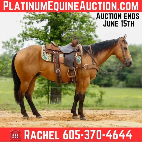 ONLINE AUCTION Place your bids at www.PlatinumEquineAuction.com Starting Bid $3500 Auction ends June 15th, 2025 Need a new saddle? Check out White Rock Saddles on our website or Facebook! Hollywoods Smoke Bar aka Tigger is a 7 year old AQHA buckskin gelding, He stands 15 hands tall and has an excellent pedigree that goes back to Hollywood Dun It! Tigger is a quiet and easy going gelding, he has been trail rode all over, he crosses the creeks, logs and goes anywhere he is asked! Tigger also has a good start in the arena, he lopes nice circles, rides collected and is soft and easy to ride. He knows his leads, has a nice stop and pivots nicely. Tigger has been shown in the Ranch Riding and Trail classes and would excel in the arena. He has also been used outside a lot for most all aspects of ranch work! From doctoring cattle outside to sorting and penning cattle he has done it all! He has a good move in the gate and is quick when he is asked to be! Tigger is a super nice all around gelding! Call or text TR Livestock Rachel 605-370-4644 for more info. He is located in Rusk TX, nationwide shipping is available! ONLINE AUCTION Place your bids at www.PlatinumEquineAuction.com Starting Bid $3500 Auction ends June 15th, 2025 Need a new saddle? Check out White Rock Saddles on our website or Facebook!
