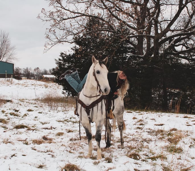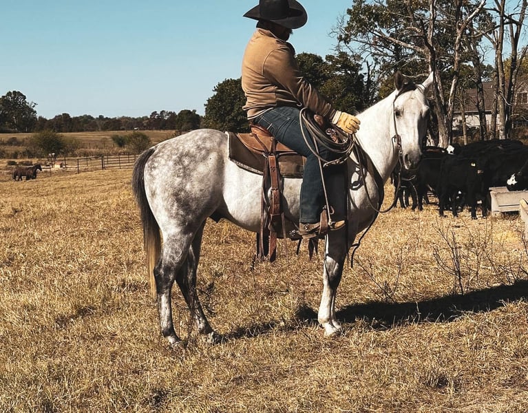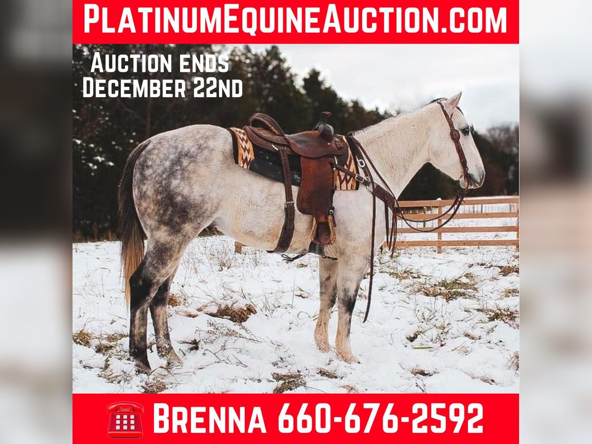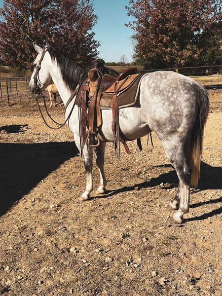ONLINE AUCTION Place your bids at www.PlatinumEquineAuction.com Starting Bid $3500 Auction ends December 22nd, 2024 Need a new saddle? Check out White Rock Saddles on our website or Facebook! If you are on the lookout for an extremely versatile, handy, good minded, and absolutely stunning gelding to add to your life look no further! This guy is the whole package. “Goose” is a 6 year old gorgeous dapple grey gelding standing right at a perfect 15 hands tall. I do not have enough good things to say about this horse. I have throughly enjoyed every moment of being around him and he has been a barn favorite amongst everyone he meets! Goose here has all the bells and whistles you could ask for. A butter smooth one hand neck rein, super smooth walk, trot, lope both ways. He is super soft throughout his body and will side pass, stops on a dime, turns on his hind quarters, and yields to pressure phenomenally. My favorite thing about Goose is despite being so broke and soft he is ALWAYS looking for the right answer. Goose takes good care of his rider and will adjust to meet their needs experienced or not. Goose here is not shy to a hard days worth of work. He’s been day worked off of a significant amount. From catching and doctoring cattle, to checking fence lines, working the stock yards, giving lessons, trail rides, turning a few steers out of the box, and even just your good ole fun show. He has proven to be trusty in all sorts of situations! Goose here is one you can pull out of the pasture in the dead of winter and hop on with zero worries or fuss. He will be the same horse every time. Goose is also super fun to trail ride! He isn’t spooky or buddy sour. Goose is very surefooted and crosses anything you ask will ease & will be happy to boogie down any road or trail you choose! Goose is great to catch, handle, load, shoe, and bathe. He’s very easy keeping and stalls well or does great in a pasture with his pals! Despite being so well behaved, I have also come to find everywhere I go I get compliments on just how handsome he is. He is super shapey and built to last, all wrapped up in the prettiest shade of dapple grey you will find on one! This is such a nice gelding with loads of potential to do absolutely anything in the world with. You do not want to miss out on him. Come meet him, you are sure to fall in love just as I have! He is located in Fulton MO. Feel free to reach out and call/text Brenna Hurt 660-676-2592 with any further questions! Thanks for looking, and God bless! ONLINE AUCTION Place your bids at www.PlatinumEquineAuction.com Starting Bid $3500 Auction ends December 22nd, 2024 Need a new saddle? Check out White Rock Saddles on our website or Facebook!