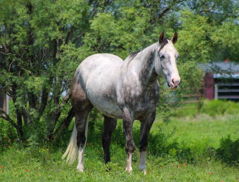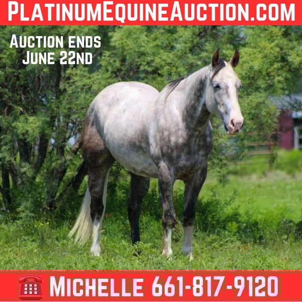 ONLINE AUCTION Place your bids at www.PlatinumEquineAuction.com Starting Bid $3500 Auction ends June 22nd, 2025 Need a new saddle? Check out White Rock Saddles on our website or Facebook! Meet Armani, the stunning first-class gelding that everyone’s been searching for! At just 7 years old and standing a solid 15 hands tall, he’s not only a head-turner with his gorgeous dapple grey coat and all the chrome you could ask for, but he’s also a true gem when it comes to versatility. Armani has dabbled in a little bit of everything, from ranch work to hitting the trails, and he’s always ready to tackle whatever job you throw his way. This handsome guy has spent plenty of time working on the ranch, checking cattle, riding fence lines, sorting, and shipping cattle. He truly knows what it means to put in a hard day’s work! When it comes to trail riding, Armani has seen it all—from the rolling hills of Texas to the breathtaking landscapes of Wyoming. He’s sure-footed and has a heart the size of Texas, confidently navigating up and down mountains, crossing logs, ditches, and bridges, and breezing through brush without a hitch. He’s encountered all sorts of wildlife out on the trails, and he takes it all in stride. What’s more, Armani has the easygoing attitude of an old soul. He’s a super sweet guy who loves being around people and thrives on attention. In the arena, he’s a star! He will walk, trot, and lope circles like a pro, carries a flag with pride, and walks over tarps without a second thought. Armani has even tackled extreme trail courses, happily going over logs, splashing through water, and stepping over tires, always giving 110% and ready for more. He’s been out in town, riding down busy highways with traffic zooming by, and he marched right through the famous Fort Worth Stockyards like the seasoned pro he is. Everyone who meets Armani falls head over heels for him. He’s an exceptional young gelding with a heart of gold, watch his video and see how truly amazing and versatile he is. We are open to anyone interested in him to schedule a time to come see him or if you can’t make it schedule a FaceTime showing to see him. If you need help with transport don’t hesitate to ask we have a list of reputable haulers that can get him safely to your doorstep WORLD WIDE including, Alaska , Mexico, Hawaii, Canada and anywhere in between from Stephenville, TX. Contact M$ Performance Horses Michelle 661-817-9120 with any questions. ONLINE AUCTION Place your bids at www.PlatinumEquineAuction.com Starting Bid $3500 Auction ends June 22nd, 2025 Need a new saddle? Check out White Rock Saddles on our website or Facebook!
