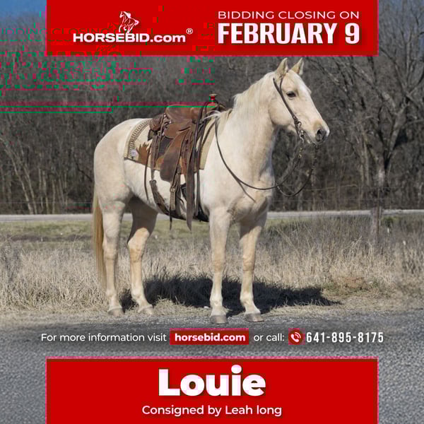 ❤️🔥𝑩𝒆 𝑴𝒊𝒏𝒆 𝐒𝐄𝐋𝐄𝐂𝐓❤️🔥 Happening now thru MONDAY | FEBRUARY 9th - Available EXCLUSIVELY on HorseBid's website! For more details and to register visit: www.Horsebid.com CONSIGNOR CONTACT: Leah long 641-895-8175 LOCATION: Sulphur Springs, TX BREED: QH REGISTERED: No REGISTERED NAME: Louie COLOR: Palomino HEIGHT: 15 AGE: 8 GENDER: Gelding ✨ Louie – Stout, Golden, and Ready for the Trail ✨ Louie is an 8-year-old grade palomino gelding standing a solid 15 hands tall with a stout build and a kind, eye-catching presence. He is easy to catch, leads, loads, and ties well, stands quietly for the farrier, and is patient and mannerly for baths. Louie is super friendly with a soft, kind eye that draws people to him wherever he goes. On the trail, Louie is a true professional. He confidently crosses anything you point him at steep ditches, big logs, and deep water without hesitation. He has been taken on overnight camping trips through rough terrain and handles it all like a seasoned pro, staying steady, willing, and dependable the entire way. Louie has also been used on the ranch, where he has pushed and penned cattle and shown that he genuinely enjoys having a job to do. He is honest, willing, and straightforward to ride. While he has never offered any funny business, he is best suited for an intermediate rider due to his quicker walk, which may feel like a lot for a timid beginner. Louie is 100% sound, has a great mind, and is the kind of gelding you can count on to take care of his rider while still being fun to ride. A solid, good-looking palomino that’s ready to go to work or hit the trails.