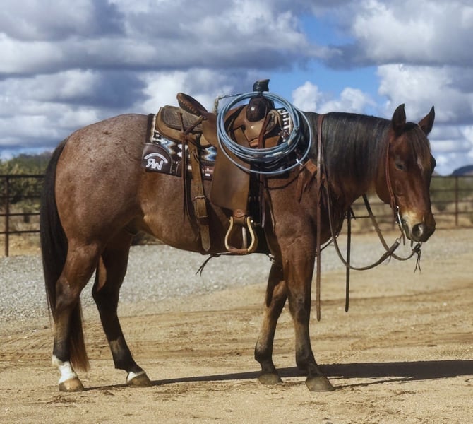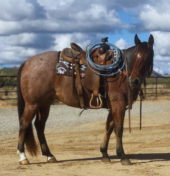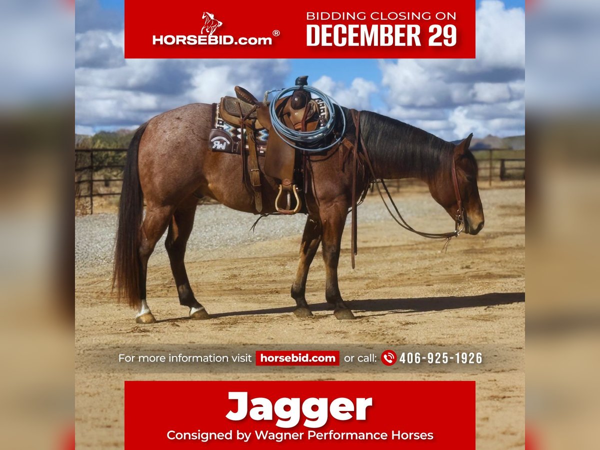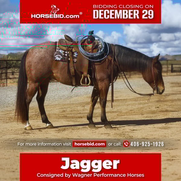 ⚜️𝐓𝐇𝐄 𝓗𝓮𝓻𝓲𝓽𝓪𝓰𝓮 𝐖𝐢𝐧𝐭𝐞𝐫 𝓒𝓵𝓪𝓼𝓼𝓲𝓬⚜️ Happening now thru MONDAY | DECEMBER 29th - Available EXCLUSIVELY on HorseBid's website! For more details and to register visit: www.Horsebid.com CONSIGNOR CONTACT: Wagner Performance Horses 406-925-1926 LOCATION: Congress, AZ BREED: AQHA REGISTERED: Yes REGISTERED NAME: Playsum Money Jagger COLOR: Bay Roan HEIGHT: 15 AGE: 7 GENDER: Gelding Meet Jagger, a stunning 7-year-old roan gelding with the looks, talent, and mind everyone is searching for. Jagger is a finished, money-earning heel horse and is also solid in the breakaway pen. He has been successfully roped on at college rodeos, yet is quiet and forgiving enough that he’s been ridden and roped on by a 78-year-old gentleman; that’s how safe and gentle he truly is. Jagger has been ridden & won from the 12 ropings down to the 8 ropings. This is a horse that anyone can ride. Jagger is kind, honest, and easy to get along with. He’s just as happy going down the road or out on the trails, where he’s calm, confident, and a pleasure to ride. Jagger has been ridden on the ranch. He has branded, gathered and drug calves to the fire. Jagger was started by a reining cow horse trainer and has a solid foundation and is handy to ride around. Jagger was just flexed and trotted at the vet and passed with flying colors.