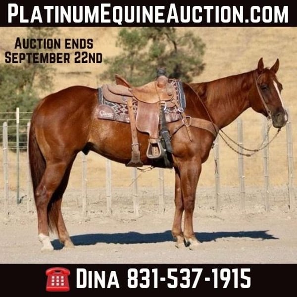 ONLINE AUCTION Place your bids at www.PlatinumEquineAuction.com Starting Bid $3500 Auction ends September 22nd, 2024 Need a new saddle? Check out White Rock Saddles on our website or Facebook! Meet Cicis Golden Boy, affectionately known as “Boy,” a stunning AQHA 2018 gelding standing proudly at 15.1 hands. This gentle gelding boasts an eye catching roaning pattern in his flank and a charming coon tail that adds to his unique appeal. With a heart as big as his stature, Boy has dabbled in just about everything from gathering cattle with ease to showcasing finesse in the arena with a beautiful collected headset and impressive turnaround and a really beautiful sliding stop. Adventure is second nature for him; he’s been out on trails where he confidently navigates wildlife encounters and steep inclines without batting an eyelash. His training is thorough he’s been desensitized to flags and tarps and effortlessly tackles trail obstacles like tires and bridges, making each outing not just enjoyable but also stress free for both horse and rider. Boy has been rode down busy streets with cars,motorcycles, big trucks, and trains he showcased his calm stature with all of it. Friendly by nature, Boy tacks up beautifully, stands calmly for grooming or clipping sessions, and behaves impeccably for the farrier’s care. Whether he’s enjoying life in pasture or cozying up in a stall setting, loading into trailers is no trouble at all for this easygoing fellow. Suitable for riders of all levels thanks to his can-do attitude and steady demeanor, Boy possesses many more years ahead to become your ultimate partner! His versatility shines through imagine him strutting his stuff in the show ring across English or Western disciplines; whether it’s ranch work or pleasure riding you seek, this reliable horse promises joy for countless rides to come.Please contact Longhorn Ranch Dina 831-537-1915 located in Paicines, CA. ONLINE AUCTION Place your bids at www.PlatinumEquineAuction.com Starting Bid $3500 Auction ends September 22nd, 2024 Need a new saddle? Check out White Rock Saddles on our website or Facebook!