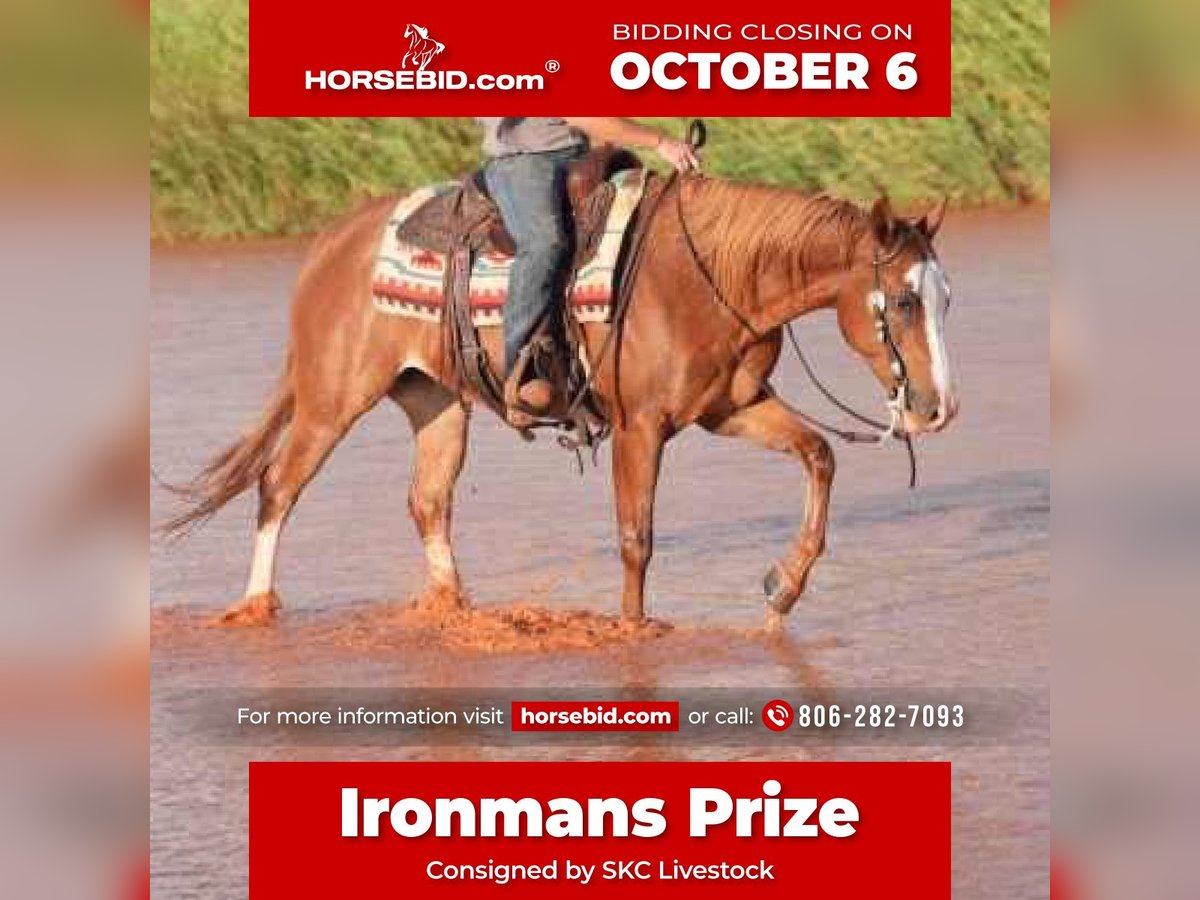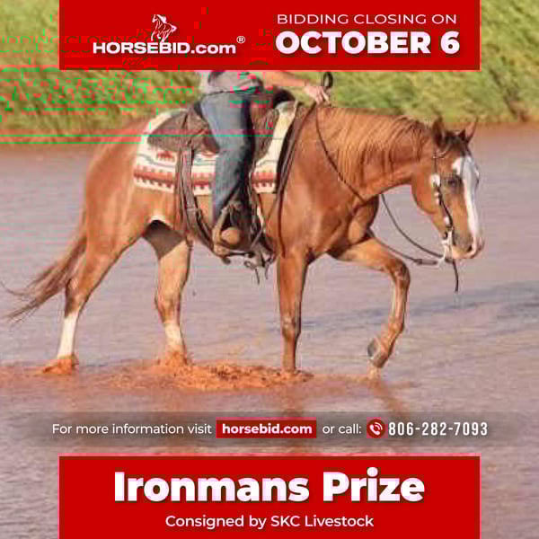 🍂 𝓐𝓾𝓽𝓾𝓶𝓷 𝑨𝑳𝑳 𝑺𝑻𝑨𝑹 𝑳𝑰𝑵𝑬𝑼𝑷 🍂 Happening now thru MONDAY | OCTOBER 6th - Available EXCLUSIVELY on HorseBid's website! For more details and to register visit: www.Horsebid.com CONSIGNOR CONTACT: SKC Livestock 806-282-7093 LOCATION: Canyon TX BREED: AQHA REGISTERED: Yes REGISTERED NAME: Ironmans Prize COLOR: Sorrel HEIGHT: 15.1 AGE: 7 GENDER: Gelding This 15.1 hand chestnut gelding is the complete package—size, talent, and a kind, gentle personality that makes him youth and non-pro suitable. He’s been shown in the NRHA, proving himself in the show pen with smoothness and style, yet he’s just as comfortable outside on the ranch or trail. He’s a big, solid gelding with a presence that’s hard to overlook, and he’s always eager to please. This gelding has everything you’ll want in a versatile partner. His transitions are silky smooth, his spins are powerful and correct, and his lead changes are effortless. He cruises through beautiful circles with eye-catching cadence and balance. Outside the arena, he’s been used to start colts, he crosses all obstacles with confidence, and he’s trained to curbside mount for convenience. Whether you’re looking for a show partner, a dependable ranch horse, or a family-friendly mount, he checks every box. With his combination of training, ability, and disposition, he would make an outstanding ranch riding candidate or simply a trustworthy, enjoyable gelding to have in your barn. He’s the kind you’ll love everything about—gentle, talented, and truly built to be versatile.