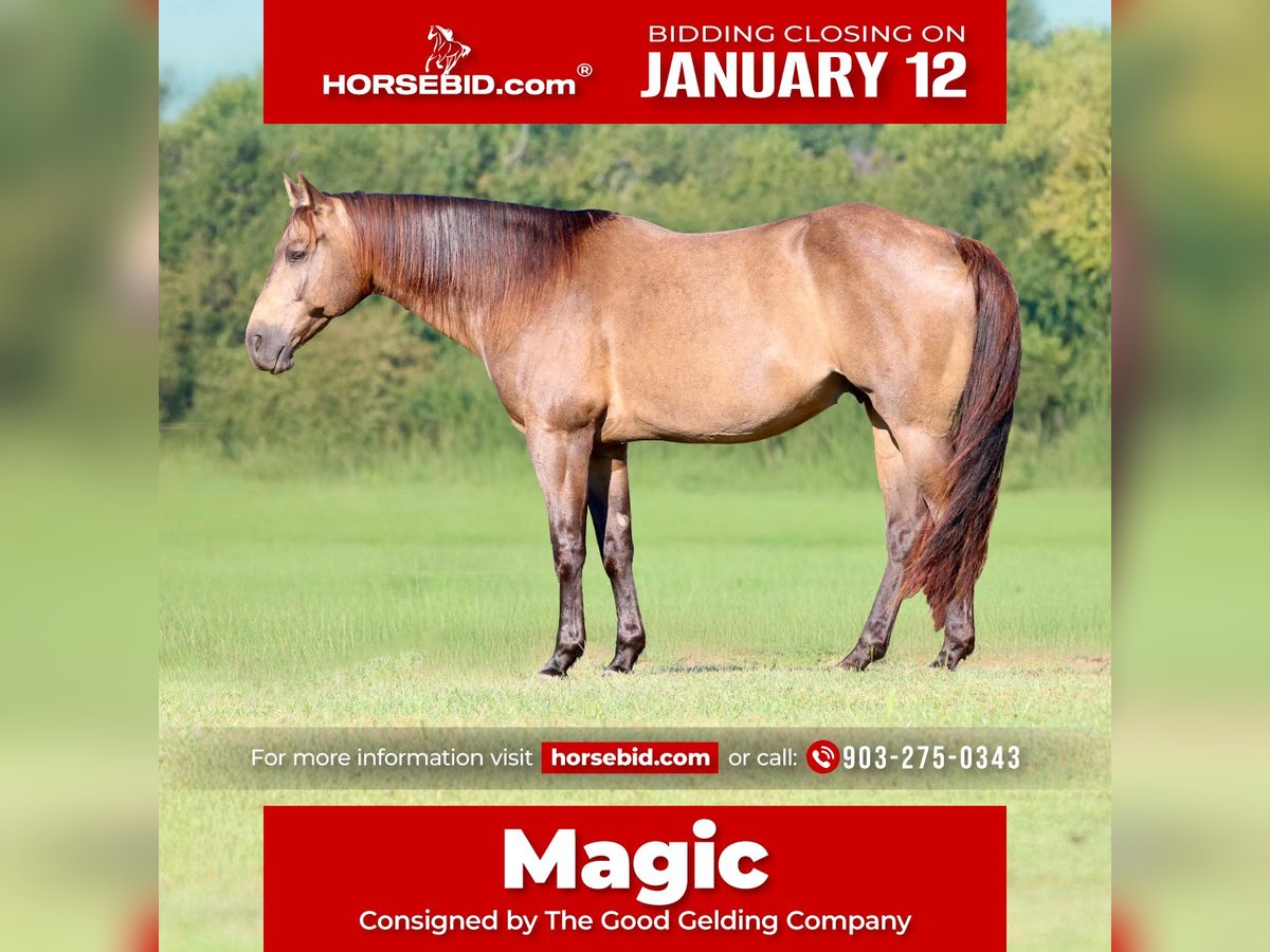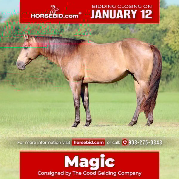 ♦️𝐍𝐄𝐖 𝐘𝐄𝐀𝐑'𝐒 𝑬𝒙𝒕𝒓𝒂𝒗𝒂𝒈𝒂𝒏𝒛𝒂♦️ Happening now thru MONDAY | JANUARY 12th - Available EXCLUSIVELY on HorseBid's website! For more details and to register visit: www.Horsebid.com CONSIGNOR CONTACT: The Good Gelding Company 903-275-0343 LOCATION: Athens, TX BREED: Quarter horse REGISTERED: Yes REGISTERED NAME: GGC Magic COLOR: Buckskin HEIGHT: 15.1 AGE: 8 GENDER: Gelding Magic is a well-made, 8-year-old sooty buckskin gelding standing 15.1 hands, offering an exceptional combination of training, versatility, and genuine kindness. He has a solid western foundation and works collected and soft in the bridle, willingly responding to seat and leg with a quiet, educated feel. His time in a lesson program has further polished his mind, making him forgiving, consistent, and suitable for riders of varying experience levels. Outside of the arena, Magic is a seasoned and confident trail partner. He has been extensively trail ridden through the Pennsylvania mountains, where he confidently crosses water, navigates uneven terrain, and steps over logs with ease. He is steady, sure-footed, and dependable—equally content leading or following, alone or in company. Magic’s education extends well beyond western riding. He has experience in dressage and over fences, contributing to his excellent balance, body awareness, and smooth, correct transitions. He has also been exposed to playdays and fun shows, where he proved to be willing, adaptable, and unflappable in new environments. Whether you are seeking a quiet yet capable trail companion, a handy ranch-style gelding, or a polished all-around partner that transitions seamlessly between English and western disciplines, Magic fits the bill. He is the kind of horse that can be enjoyed immediately while continuing to shine for years to come. Magic has had a clean pre-purchase exam, and front-foot radiographs are available upon request.