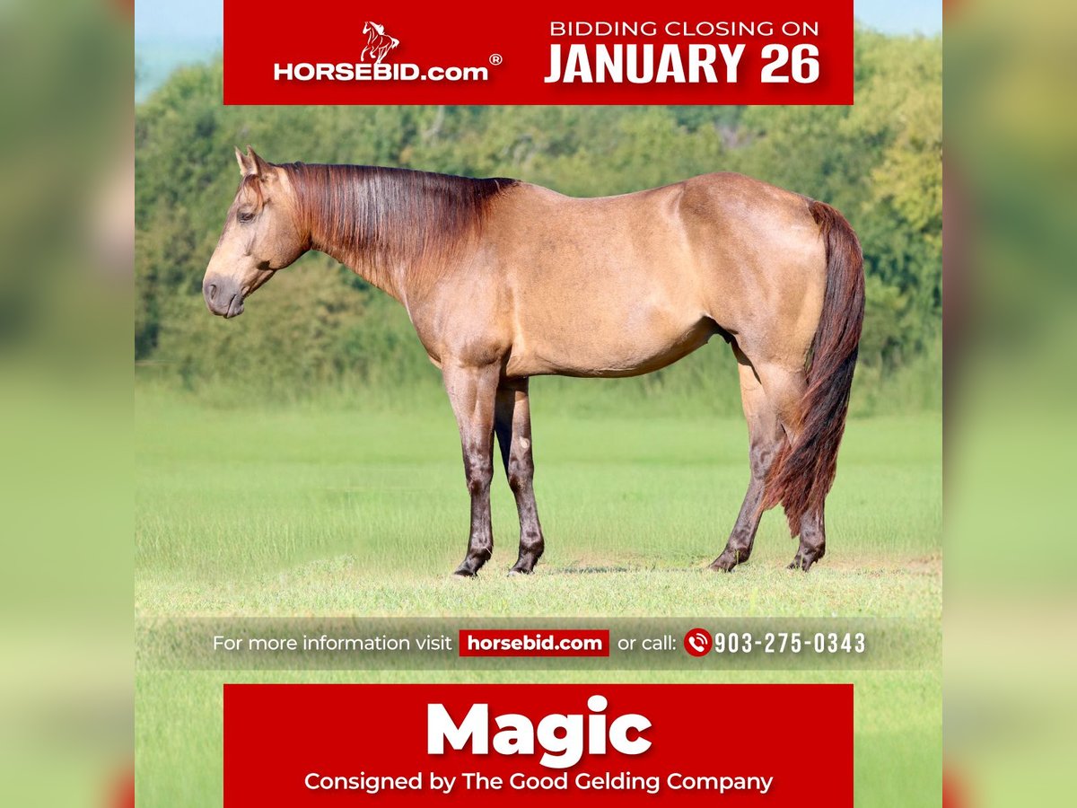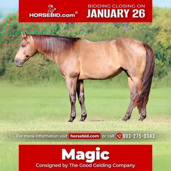 𝐉𝐀𝐍𝐔𝐀𝐑𝐘 ⭐️𝑨𝒍𝒍 𝑺𝒕𝒂𝒓 𝑳𝒊𝒏𝒆𝒖𝒑⭐️ Happening now thru MONDAY | JANUARY 26th - Available EXCLUSIVELY on HorseBid's website! For more details and to register visit: www.Horsebid.com CONSIGNOR CONTACT: The Good Gelding Company 903-275-0343 LOCATION: Athens, TX BREED: Quarter horse REGISTERED: Yes REGISTERED NAME: GGC Magic COLOR: Buckskin HEIGHT: 15.1 AGE: 8 GENDER: Gelding If you’ve been searching for that do-it-all partner — steady on the trail, broke in the arena, and kind enough for most riders — meet Magic, an 8-year-old, 15.1 hand sooty buckskin gelding. Magic is the kind of gelding everyone dreams of owning. He’s had a solid western foundation, rides collected and soft in the bridle, and is responsive to leg and seat. He’s been used in lessons, making him quiet, forgiving, and trustworthy for riders of most levels. Out of the arena, he’s as solid as they come — trail-tested through the Pennsylvania mountains, where he’ll cross water, step over logs, and carry his rider safely through any terrain. In addition to his western handle, Magic has dressage and jumping experience, giving him exceptional balance, body control, and smooth transitions that make every ride a pleasure. He’s also spent time at playdays and fun shows, where he’s proven himself steady, willing, and happy to try new things. Whether you’re after a calm trail companion, a handy ranch-style gelding, or a versatile horse that can switch effortlessly between English and western, Magic checks every box. He’s the type of horse you can enjoy for years to come.