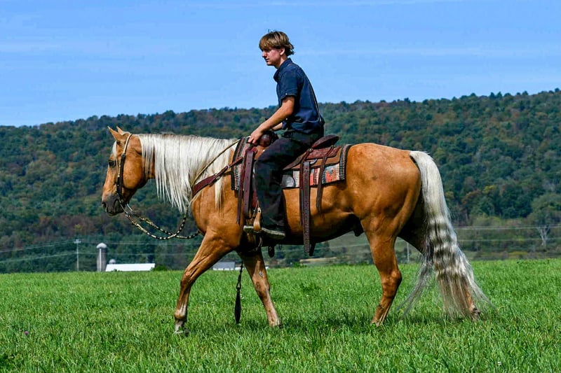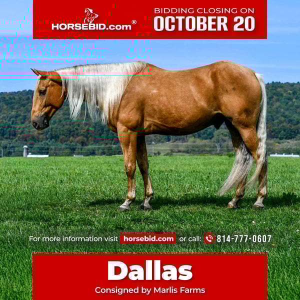 ♦️ 𝐭𝐡𝐞 𝐀𝐌𝐄𝐑𝐈𝐂𝐀𝐍 𝓕𝓪𝓵𝓵 𝓒𝓵𝓪𝓼𝓼𝓲𝓬 ♦️ Happening now thru MONDAY | OCTOBER 20th - Available EXCLUSIVELY on HorseBid's website! For more details and to register visit: www.Horsebid.com CONSIGNOR CONTACT: Marlis Farms 814-777-0607 LOCATION: Rebersburg PA BREED: Quarter Horse REGISTERED: No COLOR: Palomino HEIGHT: 15.1 AGE: 7 GENDER: Gelding Dallas is a 7 year old gelding standing at 15.1 hands that’s well built and beautiful! He is very versatile, rides English and western and loves to go out on the trails! Dallas is safe, reliable and user-friendly! He has a very smooth, well balanced walk, trot and canter. He picks up both leads, he knows the word “woah” and has a good stop, back up, he neck reins, side passes and is very soft in the bridle! Dallas has no silly quirks, his gentle and forgiving personality makes him suitable for more inexperienced riders! On the trails is where Dallas really shines! He absolutely loves adventure. We have ridden him up in the mountains and down through town and he’s enjoyed every bit of it! Dallas has no spook and easily crosses over logs, bridges, creeks, railroad tracks etc. He is traffic safe and doesn’t mind the commotion of busy streets, pedestrians, dogs or bicycles! Dallas is all around a good boy and a reliable horse to have in the barn! He has good manners, he stands well for the vet, farrier and dentist! No bad habits or vices, he can be turned out in a mixed herd or be stalled. Dallas sells 100% sound and ready to move into his forever home! For more information or to schedule a visit to meet Dallas, call Mark @ 814-777-0607