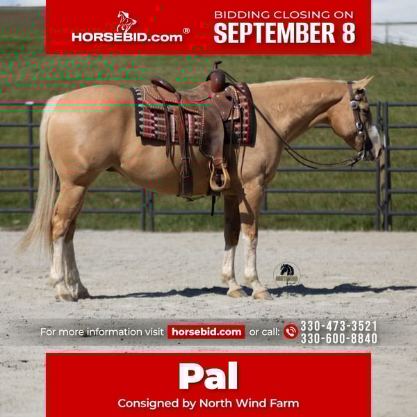 ♦️ 𝐭𝐡𝐞 𝐒𝐞𝐩𝐭𝐞𝐦𝐛𝐞𝐫 𝑺𝒆𝒍𝒆𝒄𝒕 ♦️ Happening now thru MONDAY | SEPTEMBER 8th - Available EXCLUSIVELY on HorseBid's website! For more details and to register visit: www.Horsebid.com CONSIGNOR CONTACT: North Wind Farm 330-473-3521. 330-600-8840 LOCATION: Fredericksburg, OH BREED: Quarter horse REGISTERED: No COLOR: Palomino HEIGHT: 15.1 AGE: 8 GENDER: Gelding Meet Pal! Pal is an 8 yr old grade palomino quarter horse gelding, standing at 15.1hh. He is well trained to ride! He has smooth canter and comfortable transitions! He can be rode English and Western. He can also be rode bridless! He stands to be groomed and for tacking up! Pal loads and travels well. Pal prefers being turned out in the field and is easy to catch. He is a sweet gelding with a lot of try! Pal shines the brightest in a program with consistentancy! He knows his job and loves doing it! He is a great trail horse, he will go up and down steep hills, surefooted and with confidence! He has no problem crossing creeks, he steps over logs and other obstacles with ease. He has been on a 2 day wagon train ride. He ties good overnight. He has also been to the state park and other large trail rides! Pal loves the trails and is very confident going out alone too! He will cross the obstacles, walks through the tarp, and noodles! He will also carry the flag! Pal rides good in the arena, he will pick up both leads, he stops, and backs up nicely. He will do the maneuvers or backing to logs and doing a pivot in the box. He has a nice side pass too! Pal rides English as well. He has been started on the low jumps and is doing great! He is calm and collected but will move out and do almost anything without having to be pushed forward all the time! He is a very fun ride, and has the willingness to excel in any discipline! If you’re looking for a willing gelding, that’s pretty to look at as well Pal is your guy! He is 100% sound and healthy! Contact us for more information or to meet Pal! ⭐️North Wind Farm is renowned for its quality trail and all-around horses. Our horses are versatile and can excel in any discipline, making them perfect for riders of all levels. Whether you're looking for a reliable trail companion or a horse that can perform in various disciplines, North Wind Farm has the perfect match for you. Our commitment to excellence and passion for equine care ensures that each horse is well-trained, healthy, and ready to meet your needs. Contact us @ Tim (330)600-8840 Lisa (330)473-3521
