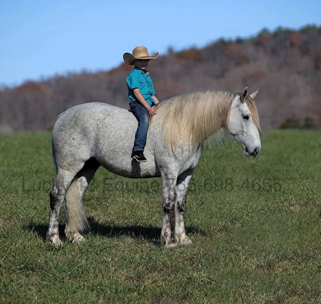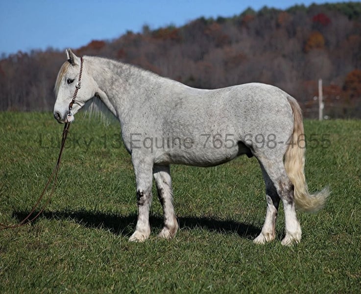 ONLINE AUCTION Place your bids at www.PlatinumEquineAuction.com Starting Bid $3500 Auction ends January 12th, 2024 Need a new saddle? Check out White Rock Saddles on our website or Facebook! Action Jackson is always ready for lifes next adventure! With his contrasting dapple grey coloring, that long flowing mane and tail or his sweet personality… he sparks folk’s attention from all angles! Jackson is a well built 15.2hh, 2018 model, Grey Draftcross Gelding. MAKE SURE TO WATCH HIS VIDEO!!! His name might suggest that he’s just here for adventure and he knows how to go to a job but if a relaxing ride is what you are looking for, then that is exactly what he is wanting to do! Jackson can do anything from slow easy trail rides, pack the medicine bags while pasture roping/doctoring (hundreds of cows/calves as he has), he can push the cows around and hold anything that you tie to the horn. Jackson stands patiently and keeps the rope tight while you work the calf out in the open. If you want to come out of the box, Jackson can turn a steer and has been started on the head side. If you just want to enjoy those long slow miles on the trails with your friends, Jackson is perfectly content to just mosey along slow and easy. He will cross creeks, deadfall, rough rocky areas and scale steep slopes. Jackson is one hand broke, he reins around with ease, has a big stop and lopes very nice circles on the correct lead. Jackson is easy to ride and is safe for all levels whether you use him daily or once a month. Jackson is the type of horse that will keep grandma safe and make her feel like a cowboy all at the same time! Climb on, set back and enjoy all of the action on Jackson! Feel free to call with any questions, to set up a time to come see him or to make a buy it now offer… Lucky 13 Equine Matt 765-698-4655 or Lysandra 765-717-2041. ONLINE AUCTION Place your bids at www.PlatinumEquineAuction.com Starting Bid $3500 Auction ends January 12th, 2024 Need a new saddle? Check out White Rock Saddles on our website or Facebook!