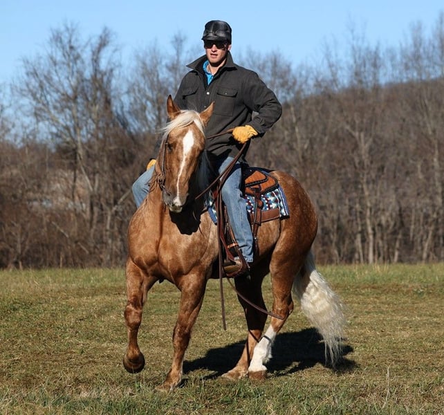 ONLINE AUCTION Place your bids at www.PlatinumEquineAuction.com Starting Bid $3500 Auction ends June 23rd, 2024 Need a new saddle? Check out White Rock Saddles on our website or Facebook! Dream horses do exist and Aspen is living proof of that! Talk about a horse that gets ALL of the looks where ever he goes!!! Aspen is a super stout built Golden Dappled Palomino Draftcross gelding standing around 15.2hh and he is 6 years old! In the fall/winter Aspen has more dapples than your eyes can count, as he is a high contrast dappled palomino. In the summer he is a dark golden palomino with chocolate highlights… he is always BEAUTIFUL!!! Aspen has been with us for almost 2 years now and we used him as my personal horse. He went through the natural horsemanship training and learned some tricks a couple years ago, where he would bow and lay down. Aspen has been used to around cattle and has caught wild ones, (roped/tied down), he has been used in the branding pen and used to doctor as well. He has been ridden down the highways, we have had him in town and he is very traffic safe. Aspen is great on trails and he will cross creeks, ditches, logs and navigate rough rocky areas. He has a smooth jog, a VERY VERY nice easy to set lope, a good stop, spins a circle both ways and backs with ease! He has been exposed to all kinds of wildlife such as deer or turkey or other animals like cows or dogs and will go anywhere that he is asked too. He has been rode many miles in the mountains of Eastern Kentucky and encountered every obstacle possible on the trail. He will go up or down even the steepest slopes, across deep creeks, over downed trees, and over all types of rough terrain while still being sure footed. Aspen is not cinchy, cold backed, does not crib or weave. Located in Level Green, KY. Feel free to call Moore Trained Horses Logan 765-265-0033 with any questions. ONLINE AUCTION Place your bids at www.PlatinumEquineAuction.com Starting Bid $3500 Auction ends June 23rd, 2024 Need a new saddle? Check out White Rock Saddles on our website or Facebook!