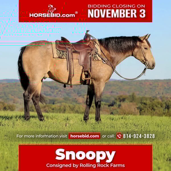 ⚜️𝐓𝐇𝐄 𝐅𝐀𝐋𝐋 𝐇𝐄𝐑𝐈𝐓𝐀𝐆𝐄 𝐂𝐋𝐀𝐒𝐒𝐈𝐂⚜️ Happening now thru MONDAY | NOVEMBER 3rd - Available EXCLUSIVELY on HorseBid's website! For more details and to register visit: www.Horsebid.com CONSIGNOR CONTACT: Rolling Rock Farms Ethan 814-924-3828 LOCATION: Miola Pa BREED: Quarter Horse REGISTERED: Yes REGISTERED NAME: RADARS CRAZY LEGEND COLOR: Buckskin HEIGHT: 15.3 AGE: 7 GENDER: Gelding If you have been searching for a true all around gelding with the mind, build, and temperament to fit the whole family, “Snoopy” (Radars Crazy Legend) is one that deserves your attention. This gorgeous 7 year old registered Quarter Horse buckskin gelding stands a solid 15.3 hands and is as correct and well made as they come. He has the kind of foundation, looks, and disposition that make him a standout anywhere he goes. Snoopy is the definition of safe, steady, and reliable. He is the same every time you swing a leg over with no spook, no silliness, and no surprises. He rides confidently both in the arena and out on the trail, and he is absolutely the kind that allows his rider to just sit back and enjoy the ride. He is exceptionally broke, with smooth transitions, a nice headset, and an easy, comfortable lope. He will both neck rein and direct rein, responding softly to your cues and always staying willing and relaxed. On the trail, Snoopy is surefooted, confident, and trustworthy. He has been ridden through water crossings, wooded trails, and uneven terrain with ease. He will go out alone or in a group without issue and has proven himself to be steady in traffic and around various sights and sounds. Just point him where you want to go, and he will take care of the rest. Snoopy’s gentle, easygoing nature makes him suitable for a wide range of riders from novices and youth to experienced adults wanting a dependable mount. He has been exposed to just about everything and handle new situations well. Whether you are looking for a trail partner, a reliable family gelding, or a versatile ranch type horse to enjoy around the farm, Snoopy fits the bill perfectly. He is also wonderful to handle on the ground. Snoopy is easy to catch in both the pasture and stall, stands quietly tied, and is respectful in every way. He is currently wearing four shoes, stands like a gentleman for the farrier, and is an easy keeper with no maintenance. He gets along well with other horses and sits comfortably in the middle to lower end of the pecking order. Snoopy is up to date on his vaccinations including rabies and has a current negative Coggins. He is sound, healthy, and ready to step into his next home where he will continue to be loved and appreciated. This gelding truly checks every box with looks, brains, size, training, and disposition. Horses like him do not come along often, and it is clear he was made to be someone’s forever partner. If you would like to check out Snoopy or have any questions please feel free to contact Ethan at (814) 924-3828.