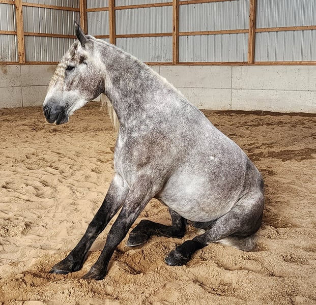 ONLINE AUCTION Place your bids at www.PlatinumEquineAuction.com Starting Bid $3500 Auction ends August 10th, 2025 Need a new saddle? Check out White Rock Saddles on our website or Facebook I’m privileged to offer you the opportunity to own this majestic, flashy gelding! Meet “Sterling”. Sterling is a 7 year old Quarter Horse-Percheron Cross Gelding, standing a stout 15.3 hands tall, weighing in around 1,300 pounds. Sterling exceeds all expectations in every direction. This honest gelding will take you in any direction, wherever you need to go. His phonomal disposition and excessive willingness to please makes him the perfect family horse. Sterling has had professional, extensive training and is truly push button. He is 100% desensitized with anything you could imagine, balls, tarps, whips, flags, farm equipment, obstacles, cows, dogs and semis. Sterling is 100% TSS. He has been ridden on main highways and through town with flags whipping and never misses a beat. Sterling is 100% neck reined as well as 100% leg pressure trained, either way you choose to ride, he’s always on point. He is a master on the trails as well as in the arena. He will stay steady and slow, or he will kick it up and move! Sterling loves water and is always confident in any situation you put him in on the trails. He crosses logs, over bridges, down the steepest hills, and up the roughest terrain with ease. You can ride Sterling bridleless, bareback, english (he loves to jump!), western, double, or hook him up to a carriage and take off! Sterling has exceptional transitions, with the smoothest trot and rocking chair lope! He stands great for the ferrier, and to be bathed. He hauls like a dream and will even load himself with no halter on. You can let this gelding sit for 6 months, pull him from the pasture, jump on and go, hes never fresh. He has no vices or bad habits. With the snap of a finger he will side pass for you to mount. He knows the word “Stay” and will only come to you once you snap your finger and tell him to “come”. Sterling sits and lays down on command for you to mount and dismount! Although it is never nessery, he will even lunge himself just for fun! He has been on countless over night camping trips, and will stay tied to a picket line all day and night with ease. He rides out alone or with large groups of people and strange horses. Sterling has no spook or buck and gets along great with other horses. He is started on cattle and gets down and gritty, he would enjoy the life on a ranch! You can throw a rope off him and he knows the drill. Sterling is no stranger to a hard days work, he will always put in 100%. Sterling is definitely a must to come check out! Please contact for more information or to set up a visit! I can arrange our own personal transportation to in sure Sterling gets to your facility safely. Located in Camden, MI. For more info contact April with Mid-West Performance Horses 260-908-5687. ONLINE AUCTION Place your bids at www.PlatinumEquineAuction.com Starting Bid $3500 Auction ends August 10th, 2025 Need a new saddle? Check out White Rock Saddles on our website or Facebook