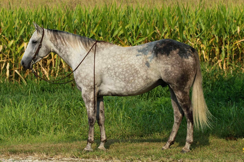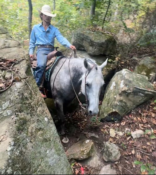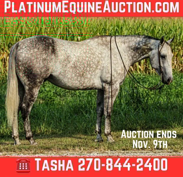 ONLINE AUCTION Place your bids at www.PlatinumEquineAuction.com Starting Bid $3500 Auction ends November 9th, 2025 Need a new saddle? Check out White Rock Saddles on our website or Facebook Waylon is a 7yr old grade quarter horse gelding standing at 15.3hh! He is a gorgeous dapple gray, with the sweetest personality! He is a dream to ride! He has the smoothest trot and canter! His walk, is easy and slow making him a great trail horse! He is very forgiving, and a great horse for all levels of riders! He is safe and dependable! Waylon moves nicely and listens to cues well! You can saddle him up and ride off or just hop on him bareback. He is as honest as the day is long and the same horse everytime you take him on a ride! We have taken Waylon to state parks on rides and overnight camping trips! He does great at new places and takes everything in stride! Waylon is great in all types of trail group settings, and will lead the pack or follow! He is remarkably surefooted, you can count on him to pay attention and navigate any terrain you put in front of him. He loves water and will cross creeks, steps over logs and doesn’t mind the steep hills! He doesn’t mind the traffic, heavy machinery and is used to being around dogs as well! Waylon has also turned back cattle, has been ridden all over the pastures checking yearlings and cow/calf pairs. He has been roping the sled and doing great. He is an all around sweet gelding and so fun to ride! Waylon also rides very well in the arena, he will pick up both leads, he stops and backs up! You can ride him on a lose rein and neck rein or he will direct rein as well! He is a very smart guy and adapts well to new riders! Waylon is one of the sweet and gentlest gelding you will meet! He is very affectionate and is the first to meet you at the gate, and will be a great asset to become a lifetime partner for the family! If you would like to schedule a time to come meet and ride Waylon, or have any other questions about Waylon feel free to reach out to Tasha with DNT Horses at 270-844-2400. We are located in Henderson KY and can assist with transportation arrangements. Don’t let this amazing gelding get away from you if you wanting something big, beautiful and dependable. ONLINE AUCTION Place your bids at www.PlatinumEquineAuction.com Starting Bid $3500 Auction ends November 9th, 2025 Need a new saddle? Check out White Rock Saddles on our website or Facebook