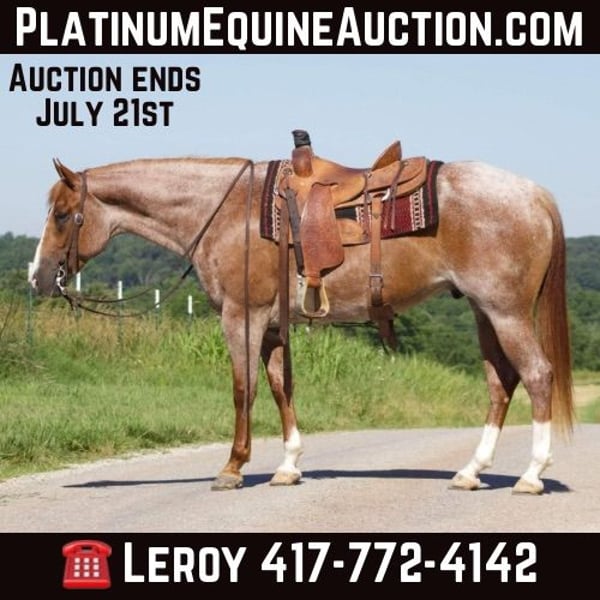 ONLINE AUCTION Place your bids at www.PlatinumEquineAuction.com Starting Bid $3500 Auction ends July 21st, 2024 Need a new saddle? Check out White Rock Saddles on our website or Facebook! Get your kids out of the house, away from the TV & outside on a good solid horse- Give them a summer to remember with Gus! Gus is a handsome red roan QH gelding. He is six years old, standing right at 15.3 hands & built like a TANK. As willing as they come, this horse has said “yes” to everything we’ve pointed him at – trail rides, riding down the road, drives through town, and the list goes on! He is a unicorn, Gus is kind and gentle enough to step right into a lesson program. Gus is SAFE, the kind of horse that will take care of his rider. He is the ultimate package with his sweet and loving disposition along with the flashy moves. Gus is BROKE, he rides around like a broke horse should and has all the buttons you could ever need. He neck reins, stays light in the bridle & floats through his gaits. Lopes nice circles, smooth stop, moves off leg pressure & is easy easy easy to get along with! If your kids can hold the reins- they can ride Gus. We have been beyond impressed with how relaxed he has been around all the jam-packed action at our facility. Gus rides any way you want (bareback, western or English). Anyone can safely & easily handle Gus. No kick, bite or funny business. Excellent to saddle, bridle and mount. Good with his feet and an absolute gentleman for the farrier. Up to date on vaccines and in great health. He loads well, stands tied, can be turned out alone or in a herd, does well in a stall, and has excellent ground manners. Respectful, polite and willing to please, Gus is ready for his forever home and a person to call his own! Located in Purdy, MO. Contact Schrocks Performance Horses Leroy 417-772-4142. ONLINE AUCTION Place your bids at www.PlatinumEquineAuction.com Starting Bid $3500 Auction ends July 21st, 2024 Need a new saddle? Check out White Rock Saddles on our website or Facebook!