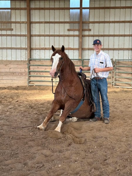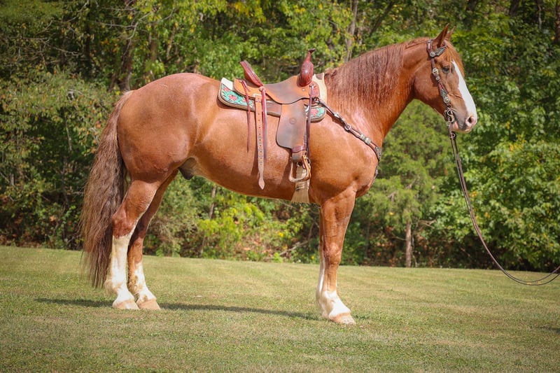ONLINE AUCTION Place your bids at www.PlatinumEquineAuction.com Starting Bid $3500 Auction ends October 13th, 2024 Need a new saddle? Check out White Rock Saddles on our website or Facebook! This is “ARNOLD”, a big stout muscular BELGIAN QUARTER CROSSBRED that is family friendly, super gentle, and very easy to ride or drive. He is 6 years old and stands 17 hands tall. He is well broke to ride and to work double or single. He has been used to pull carriages and give wagon rides at the pumpkin festivals and Christmas tree farms. He has been ridden by youth riders and will trail ride quietly for beginners. He has also been used for ranch work and is handy when you ask him to be. He will sit down and turnaround nicely and he has a big stop. He moves off of leg cues, sidepasses, and you can open and close gates off of his back. He catches his leads, jogs and lopes nice circles, and will one step lope. He has no hump and no buck. He will cross any depth of water and he is not spooky. He is traffic safe on the roads and unphased by large crowds and noisy surroundings. He unloads in new places quietly and rides off collected and calm. Beginner teamsters can drive him without any problem. He stands to harness and hitch. He loves to work and truly has a pleasant agreeable personality that makes him everyone’s barn favorite. He is super versatile. You can rope off of him, work cattle, trail ride, shown him at the hitch classes, take him on a wagon train, or skid some logs out of the woods. He is a great horse with lots of training, sense, ability, and a ton of heart. Call HH Horses Erin 304-238-4155 Located in Flemingsburg, KY. ONLINE AUCTION Place your bids at www.PlatinumEquineAuction.com Starting Bid $3500 Auction ends October 13th, 2024 Need a new saddle? Check out White Rock Saddles on our website or Facebook!