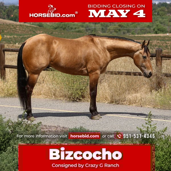▪️▫️◾️𝐭𝐡𝐞 𝑴𝒂𝒚 𝐒𝐞𝐥𝐞𝐜𝐭◾️▫️▪️ Happening now thru MONDAY | MAY 4th - Available EXCLUSIVELY on HorseBid's website! For more details and to register visit: www.Horsebid.com CONSIGNOR CONTACT: Crazy G Ranch 951-531-4346 LOCATION: Norco, CA BREED: Quarter horse REGISTERED: Yes REGISTERED NAME: Sportn Highbrow COLOR: Buckskin HEIGHT: 14.3 AGE: 8 GENDER: Gelding Registered 2018 Buckskin Gelding – “Sportn Highbrow” (Bizcocho) If you’re looking for a versatile, good-minded gelding that can truly go in any direction, take a look at Bizcocho. This eye-catching registered 2018 buckskin gelding has the looks, brains, and ability to stand out wherever you take him. Bizcocho is started on the heel side and showing all the makings of an excellent rope horse. He’s got the grit and natural cow sense you want, paired with the athleticism to excel as he continues progressing. In the arena, he’s a started reiner with all the right buttons. He has a big stop and “whoa,” a nice spin, and clean flying lead changes. He rides around soft, collected, and fancy, making him just as enjoyable for arena work as he is functional. Outside, Bizcocho is a safe and dependable partner for the whole family. He’s easy to ride on the trail, confident both alone or in a group, and handles new environments with a level head. On the ground, he’s as good as they come — gentle, kind, and has that puppy-dog personality everyone loves. He’s easy to be around, willing, and consistent day in and day out. Bizcocho has the ability and mindset to go any direction — whether you’re looking for a rope horse, show horse, or a solid all-around partner, he’s ready to fit the job. ✨ Versatile, talented, and safe — the total package.