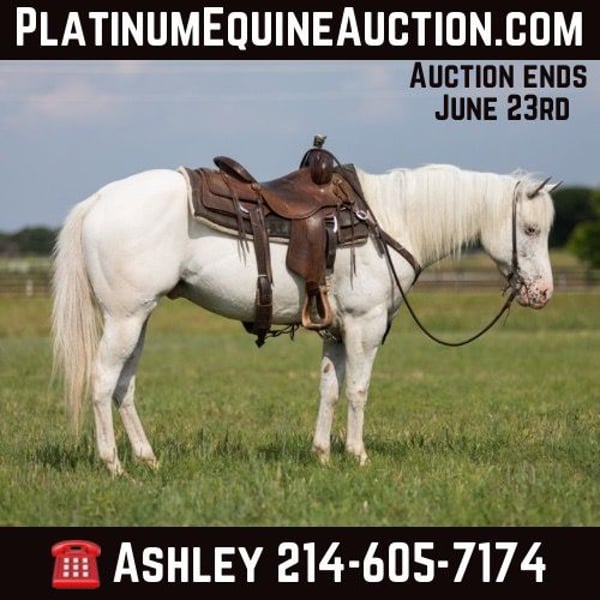 ONLINE AUCTION Place your bids at www.PlatinumEquineAuction.com Starting Bid $3500 Auction ends June 23rd, 2024 Need a new saddle? Check out White Rock Saddles on our website or Facebook! Tux is a 14H, 7 year old POA gelding. Tux has a ton of personality and can go any way you want him to go! He has done the all-around 4H and entry level shows with his last rider, has been ridden a ton outside and on trail rides, has checked the pasture, fences, and cattle on the place – and has even been ridden into town and in a couple of parades. He has enough energy to be a fun step up from the total dead-head half asleep first horse, but is relaxed and safe enough for just about anyone to be able to get along with and enjoy. He travels super cute and would be fun to take to the entry level dressage or hunter jumper shows in the pony classes. He has a great stop – and he has also been started tracking the dummy and had a rope thrown off of him. He lives happily outside with others or in the barn, easy keeper, great feet, no bad habits or vices, good ground manners, loads, stands tied anywhere – always first up to you and happy to see you in the pasture. This will make a great little horse for any rider wanting to try a little bit of everything and enjoy their ride every time. He was a huge hit when we took him to town to get videos around traffic – he absolutely has the most endearing adorable fun personality and everyone has to come say hi to him. He is that big cuddly friendly golden retriever in dog form, he stares you down with his big puppy dog eyes until he gets your attention, and you cant help but come over and interact with him. Two weeks ago, Tux was trimmed by the farrier, his teeth were done by an equine dentist, he had his sheath cleaned, his ears treated for ticks, and he was also power packed wormed. He is also great to shoe, but has great feet and goes well barefoot – if his new owner prefers him to be shod, we can have him shod prior to him heading to his new home. He will arrive at his new home up-to-date and ready to go to work! We are experienced, knowledgeable sellers, and we can help with quickly arranging affordable shipping to any buyer’s location – we have experience shipping worldwide – including regularly to Hawaii, Canada, Mexico, Europe, and South Africa. Located in Weatherford, TX. Contact Ashley at Buster Horses 214-605-7174. ONLINE AUCTION Place your bids at www.PlatinumEquineAuction.com Starting Bid $3500 Auction ends June 23rd, 2024 Need a new saddle? Check out White Rock Saddles on our website or Facebook!
