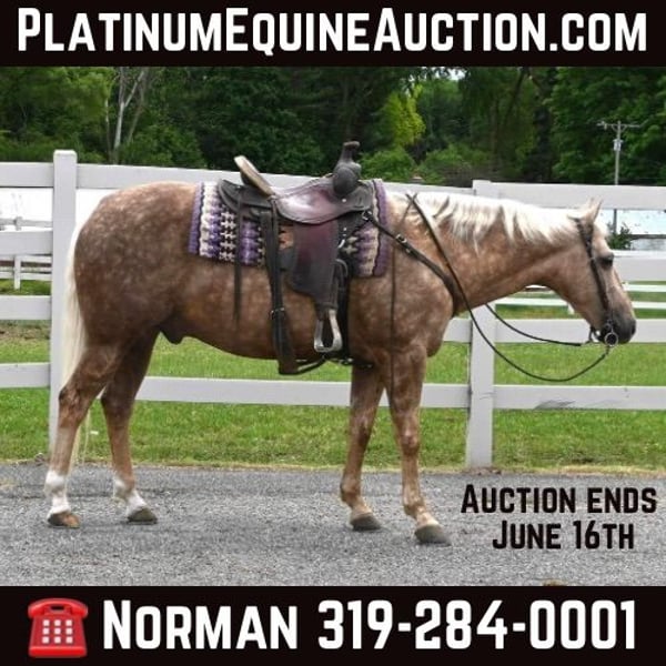 ONLINE AUCTION Place your bids at www.PlatinumEquineAuction.com Starting Bid $3500 Auction ends June 16th, 2024 Need a new saddle? Check out White Rock Saddles on our website or Facebook! Meet Trigger!! He is a total dream horse that catches everyone’s eyes, no matter where you go! From his beautiful golden dappled coat, to his sweet disposition… their is nothing not to love about Trigger. He is a 14.1H, 2017 Model Registered Quarter Horse Gelding. He is broke the absolute best. Whether its english, western or bareback he does it all. He is easy to catch, saddle, bridle, groom, shoe and bathe. He has been trail ridden and knows all about rocky terrain, steep slopes, mud, crosses creeks and crosses deadfall with ease. He is safe riding down busy highways as well. Trigger will walk, trot, canter with ease. He knows his leads, leg pressure and neckreins very well. He gets along with others in the pasture and is easy to catch. Trigger is an absolute family horse type, he is gentle and quiet but if you need to get up and go he can move out as well but always calms down just as soon as he is asked. He is up to date on coggins, rabies vac and worming. He sells sound! If you have any questions contact Silverstar Stables Norman 319-284-0001 Located in Sturgis, MI. ONLINE AUCTION Place your bids at www.PlatinumEquineAuction.com Starting Bid $3500 Auction ends June 16th, 2024 Need a new saddle? Check out White Rock Saddles on our website or Facebook!