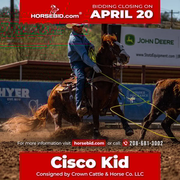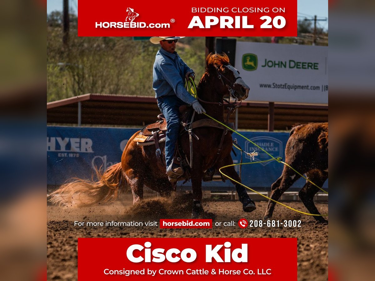 ⚜️𝐭𝐡𝐞 𝓔𝓵𝓲𝓽𝓮 𝐒𝐩𝐫𝐢𝐧𝐠 𝐂𝐥𝐚𝐬𝐬𝐢𝐜⚜️ Happening now thru MONDAY | APRIL 20th - Available EXCLUSIVELY on HorseBid's website! For more details and to register visit: www.Horsebid.com CONSIGNOR CONTACT: Crown Cattle & Horse Co. LLC 2086813002 LOCATION: Dubois, ID BREED: Quarter Horse REGISTERED: Yes REGISTERED NAME: Wickedly Cool Cat COLOR: Sorrel HEIGHT: 14.2 AGE: 9 GENDER: Gelding Are you looking for a piece of adventure and romance of the old west? “Cisco Kid” could be your modern day Robin Hood! This charming 2017 gelding sired by WR This Cats Smart and out of Chupikas Real Jewel provides a pedigree loaded with cow sense, athleticism, and a winning desire that always seems to prevail. Accompanied by his kind nature and willingness to please, Cisco Kid is exactly what you should be looking for to get to the pay window. Standing at 14.2 and weighing at 1050lbs this horse can get around a cow or stay back, helping you always see the feet and providing the precise shot you want to take. One of the greatest attributes of Cisco Kid is the honesty and control he gives you while heeling; swing over one as many times as you need or throw on the first hop he will stay true! Cisco has a very sweet demeanor and is a joy to be around. Greets you at the gate and loves to be loved on. He has been hauled to jackpots, World Series ropings, and open rodeos. Cisco Kid has also had countless numbers of cattle roped on him outside. Branding calves and doctoring cattle outside has contributed to his consistency on a steer in the arena. At Crown Cattle and Horse Co we believe the daily tasks and pressures of ranch work lay the best foundation for today’s modern rope horse. Don’t let his size fool you, there’s plenty of horse to get you down the arena in a hurry and come to perfectly timed slide stop! He would also be a wonderful prospect to breakaway rope on. Cisco Kid is tough as they come and will take a jerk like a great big horse. From the arena to roping cattle outside we have greatly enjoyed Cisco Kid and are proud to pass him on and let someone looking for an exceptional heel horse to up their game and continue winning on this amazing horse! We do not have cell phone service at the ranch so please leave us a message Wyatt- 208-709-3048 Heidi- 208-681-3002