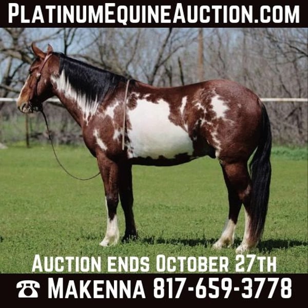 ONLINE AUCTION Place your bids at www.PlatinumEquineAuction.com Starting Bid $3500 Auction ends October 27th, 2024 Need a new saddle? Check out White Rock Saddles on our website or Facebook! This is L.P… If you’ve been trying to get your dream horse without the hassle or wait, look no more! This is the prettiest paint we have ever had and opportunity to offer! He is just 7 years old, stands 14.2hh tall and is a blast! L.P. loves a good trail ride, is obsessed with the water and dives right in everytime. He is easy to operate and doesn’t mind a less experienced rider. He isn’t a complete dead head and has plenty of go when asked. This is the SMOOTHEST horse we have ever sat on, trot and lopes just as smooth so if you have a bad back he is the one for you! L.P. loves attention, and has a fun personality! He stands to be saddled, for the farrier, and clips/bathes. We are located in Stephenville Texas and have hauling available anywhere in the U.S., Hawaii or Canada! Don’t miss out on the gorgeous paint gelding! Please call or text Makenna Hartzel 817-659-3778. ONLINE AUCTION Place your bids at www.PlatinumEquineAuction.com Starting Bid $3500 Auction ends October 27th, 2024 Need a new saddle? Check out White Rock Saddles on our website or Facebook!
