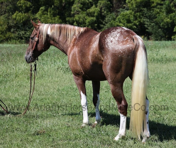 Go to www.AdamsHorseAndMuleCo.com for more pics and a video. AHAMC has been in the horse business and sold horses over the internet since 2005. We have a long track record of success with hundreds of happy customers. We work hard to match riders with the correct horses and specialize in beginner safe, family friendly horses that have been used and checked out by our family! I’ll bet you have not seen many like Astro before? Astro is an appaloosa paint gelding with snowflake spots all over with 4 big stockings and a white tail. He is standing around 15h and is 7 years old. He is friendly with lots of personality! Astro is a horse that the whole family can ride and enjoy! He has been ridden down the highways and he is traffic safe as well. Astro is great on trails and he will cross creeks, ditches, logs and navigate rough rocky areas. He has a smooth jog, a nice easy to set lope, a good stop, turns several circles both ways and backs with ease! He has been exposed to all kinds of wildlife such as deer or turkey or other animals like cows or dogs and will go anywhere that he is asked too. He has been rode many miles in the mountains of Eastern Kentucky and encountered every obstacle possible on the trail. He will go up or down even the steepest slopes, across deep creeks, over downed trees, and over all types of rough terrain while still being sure footed. Astro is not cinchy, cold backed, does not crib or weave. Astro is a once in a lifetime type of horse!!! Feel free to call Eric 606-308-2461 with any questions.