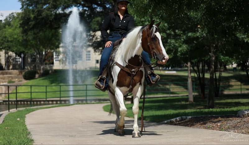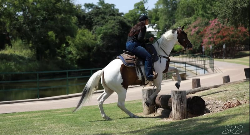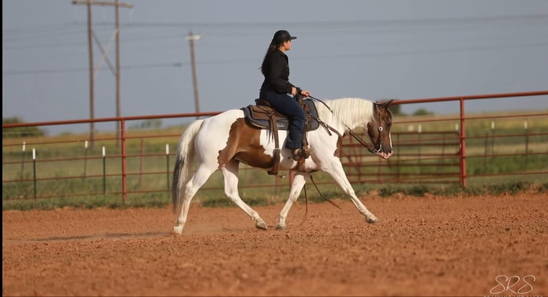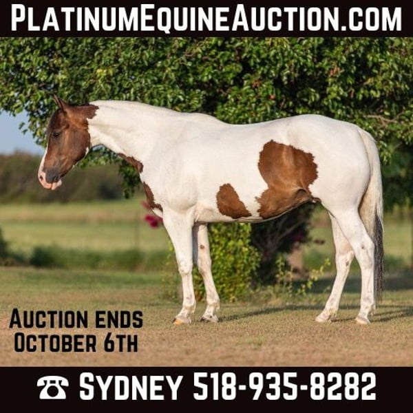 ONLINE AUCTION Place your bids at www.PlatinumEquineAuction.com Starting Bid $3500 Auction ends October 6th, 2024 Need a new saddle? Check out White Rock Saddles on our website or Facebook! “Scout” or EKPD Sand Peppy Doc is a 2017 Registered Paint gelding standing at 15 hands. Scout is a a kind and gentle gelding who is willing to go all day long. He has been started on the barrel and pole patterns. I have taken him to several gymkhana events and he has proven himself to be pretty seasoned going new places. He is calm cool and collected in the warm pen no matter who I’m riding with. He has lots of energy and makes a great using horse. Scout is willing to go through any obstacle you put in his way whether it’s flags, banners, tarps, water, lawn sprinklers and fountains, he is always ready to do what you ask when you ask it. I have used Scout to gather cattle, check fences, pony colts, trail ride, and he has always been a great companion. He rides in an arena and outside whether it’s by himself or in a group. I often take him out to check fences bareback in a hackamore and him and I both have the best time! He walk, trot and lopes both leads very easily off your leg cues. He mostly neck reins but will also listen to direct rein. Scout listens phenomenally to leg cues, he will turn around both directions and side pass left and right with ease making opening and closing gates off him a breeze. Scout is ready to be a using horse or could be finished to be one of the prettiest in the arena for gymkhanas, ranch rodeo, and ropings. He has an adorable gelding personality with excellent ground manners. He ties nicely in the barn or at the trailer to be groomed, saddled, and bathed. He hops on the trailer with ease and backs off very nicely. Scout can be outside in a pasture alone or with other horses, he also does well in a stall. He has recently been seen by my vet, farrier, dentist and chiropractor and was an excellent citizen for them all. Scout is an excellent horse that is always ready to work and be pointed in the next direction by his rider. For more information or questions please contact Sydney with SRS Training and Sales at (518) 935-8282. Scout is located in Granbury, TX. If you love Scout and are not local I am happy to help arrange shipping options that are quick and affordable all across the U.S ONLINE AUCTION Place your bids at www.PlatinumEquineAuction.com Starting Bid $3500 Auction ends October 6th, 2024 Need a new saddle? Check out White Rock Saddles on our website or Facebook!