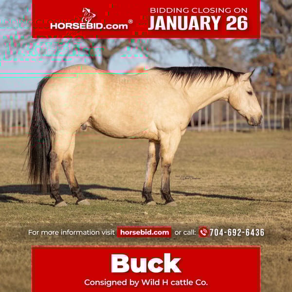 𝐉𝐀𝐍𝐔𝐀𝐑𝐘 ⭐️𝑨𝒍𝒍 𝑺𝒕𝒂𝒓 𝑳𝒊𝒏𝒆𝒖𝒑⭐️ Happening now thru MONDAY | JANUARY 26th - Available EXCLUSIVELY on HorseBid's website! For more details and to register visit: www.Horsebid.com CONSIGNOR CONTACT: Wild H cattle Co. 704-692-6436 LOCATION: Madill, OK BREED: Quarter Horse REGISTERED: Yes REGISTERED NAME: Slip Two Me COLOR: Buckskin HEIGHT: 15.1 AGE: 9 GENDER: Gelding Slip Two Me “Buck” is a 9 year old AQHA buckskin gelding standing 15.1 hands and weighing approximately 1,250 lbs. Buck is a true ranch gelding in every sense of the word. He has been extensively ranched on in Matador, Texas, as well as multiple outfits in Oklahoma. Ranching isn’t something he was introduced to yesterday, it’s his way of life. He knows what a full day’s work looks like and handles it with ease. He has dragged calves, sorted pairs, checked fences, and caught cattle in the pasture. He’s confident, dependable, and the kind of horse anyone would be proud to saddle up and head to the pasture on. Buck is a gentle giant. He’s not in a hurry, and that laid-back attitude is what makes him such a safe, confidence-building ride. He’s been down the trail and through rough country, not just groomed paths, and he takes everything in stride. In addition to his ranch experience, Buck is a finished head horse. He would be an excellent fit for a low-level roper or someone looking to get started. He is solid in the box, runs to the hip, and is strong to the saddle horn. Buck is not buddy sour, not barn sour, and none of that silly business. He’s a saddle-up, step-on-and-go kind of gelding. He stands quietly at the trailer, fence, or anywhere you tie him. He is easy to shoe, bathe, and groom. He is extremely safe and calm away from home—every clip in his video was filmed off-site. If you’re looking for a dependable, honest, been-there-done-that gelding, Buck checks every box. 📞 Please call us with any questions about Buck he truly is a great gelding in every way.