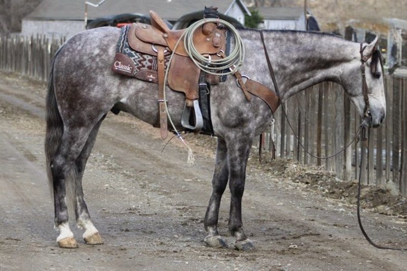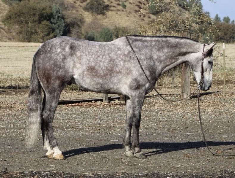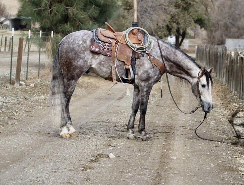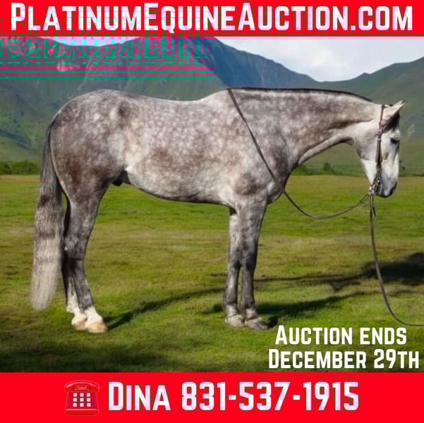 ONLINE AUCTION Place your bids at www.PlatinumEquineAuction.com Starting Bid $3500 Auction ends December 29th, 2024 Need a new saddle? Check out White Rock Saddles on our website or Facebook! Start the new year out right with this stunning 15.1-hand, 7 year old dappled grey gelding with his long beautiful mane and tail he embodies the epitome of both elegance and beauty, presenting an impressive package that captivates all who encounter him. His gentle demeanor and unwavering safety make him an ideal companion for riders of varying experience levels. On trail rides, Earl showcases his sure-footedness as he navigates through thick brush, across water crossings, and over downed trees with remarkable grace. In the arena, his fluid movement in all gaits reflects a soft and supple feel; he effortlessly stops and backs with ease a testament to his training and responsiveness. Earl’s ranch versatility shines through as he eagerly gathers cattle has branded and loaded trucks. Impressive in urban settings too, this reliable horse has been confidently ridden through congested streets amidst bustling traffic without a hint of trepidation around crowds or distractions.His cross-discipline abilities are equally noteworthy; riding English or Western allows Earl to flaunt his natural elegance fittingly suited for dressage pursuits. With a temperament that is both friendly and kind-hearted, he proves easy to handle loading into any trailer with composure while standing tied patiently at events or during grooming sessions with the farrier. Earl is so easy going you can stand up on him ride him in halter bareback while he stands there enjoying the fun. Whether participating in group rides or enjoying solo adventures under open skies, Earl consistently garners attention wherever he goes; parades are no exception as he’s participated in grand entries seamlessly navigating obstacles he will walk over bridges tires and tarps, bouncing balls nearby truly showcasing his adaptability. He is great in the pasture out with friends or will also enjoy a nice comfy stall. Earl is ready to start the new year with his new family. Please come meet this wonderful boy you won’t be disappointed contact Longhorn Ranch, Dina 831-537-1915 located in Paicines, CA. ONLINE AUCTION Place your bids at www.PlatinumEquineAuction.com Starting Bid $3500 Auction ends December 29th, 2024 Need a new saddle? Check out White Rock Saddles on our website or Facebook!