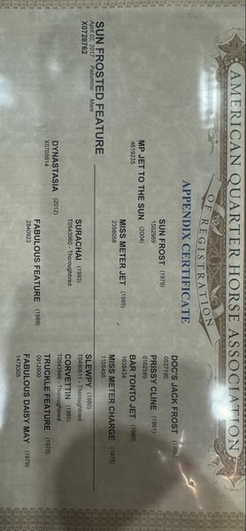ONLINE-AUKTION Geben Sie Ihre Gebote unter www.PlatinumEquineAuction.com ab. Startgebot $3500 Die Auktion endet am 10. November 2024 Brauchen Sie einen neuen Sattel? Schauen Sie sich White Rock Saddles auf unserer Website oder Facebook an! Sun Frosted Feature alias "Frosty" ist eine eingetragene 7-jährige Appendix AQHA Stute. Sie ist ein wunderschöner Palomino mit leichten Schimmelflecken in ihrem Fell und viel Chrom an ihren Beinen und im Gesicht. Sie hat eine Größe von 15,1H und ist schön und kräftig. Diese hübsche Stute hat eine große, liebenswerte Persönlichkeit, mit der man sehr leicht zurechtkommt. Sie ist ständig auf der Suche nach Aufmerksamkeit, sie ist die erste, die Sie am Tor begrüßt und wird Sie sogar gelegentlich anschnauzen. Mit einem großen Motor und mehr "Go" als "Whoa" ist sie sehr arbeitsfreudig und könnte sich in einer Vielzahl von Disziplinen auszeichnen. Frosty wurde bereits auf Barrels und Poles vorgestellt und hat das Potenzial, sich mit der richtigen Person zu verbessern. Sie geht im Schritt, Trab und Lopen am lockeren Zügel und kann ein- oder zweihändig geritten werden. Sie hört gut auf Bein- und Sitzdruck und ist immer bereit zu gefallen. Frosty sucht oft das Vertrauen ihres Reiters in Situationen, mit denen sie nicht vertraut ist, und versucht ihr Bestes, um Ihnen zu gefallen. Sie ist eine sehr große und kräftige Stute, was sie zu einem exzellenten Wettkampfpartner, einem spaßigen Wanderreitpferd oder sogar zu einer großartigen, reitbaren Zuchtstute macht. Schließlich ist sie eine Enkelin von Sun Frost", einem hervorragenden und gefragten Vererber. Frosty wurde kürzlich von meinem Tierarzt, Hufschmied, Zahnarzt und Chiropraktiker untersucht. Sie hüpft mit Leichtigkeit auf den Anhänger und lässt sich sehr gut zurücksetzen. Frosty kann draußen auf der Weide allein oder mit anderen Pferden zusammen sein, sie macht sich auch gut in einer Box. Frosty ist eine sehr pflegeleichte Hündin in meiner Anlage und es ist eine absolute Freude, sie um sich zu haben. Bei Fragen zu Frosty rufen Sie bitte Sydney von SRS Training and Sales unter 518-935-8282 an. Frosty befindet sich in Granbury, TX. Wenn Sie nicht in der Nähe sind, helfe ich Ihnen gerne, den Versand von Granbury, TX, in die USA zu organisieren. ONLINE-AUKTION Geben Sie Ihre Gebote unter www.PlatinumEquineAuction.com ab. Startgebot $3500 Die Auktion endet am 10. November 2024. Brauchen Sie einen neuen Sattel? Schauen Sie sich White Rock Saddles auf unserer Website oder Facebook an!