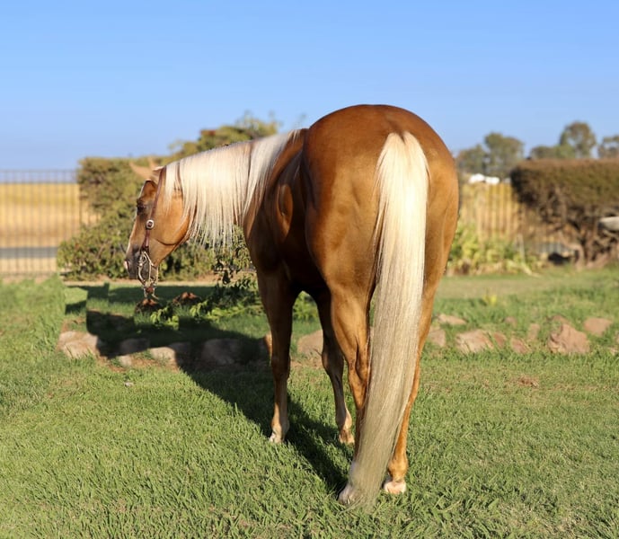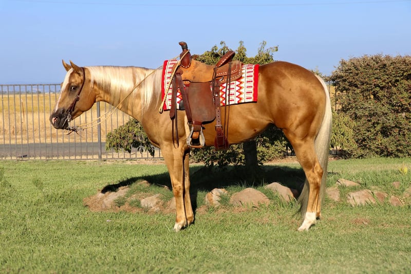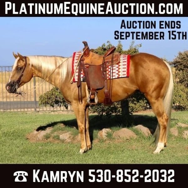 ONLINE AUCTION Place your bids at www.PlatinumEquineAuction.com Starting Bid $3500 Auction ends September 15th, 2024 Need a new saddle? Check out White Rock Saddles on our website or Facebook! Meet Cheddar, a 7 year-old 15.1 hands absolutely stunning Palomino gelding that is sure to turn heads wherever he goes. With his striking dark chocolate Palomino coat and a flowing white mane and tail, Cheddar is the epitome of “show ring gorgeous.” If you’re searching for a showstopper, look no further! Cheddar has spent most of his life in the arena and is exceptionally broke. He knows his leads with ease, slide stops, and spins, yet his slow, smooth gaits make for a comfortable ride. Cheddar has even packed around kids in the arena without any issues, making him a versatile choice. Whether you’re riding him daily, weekly, or even monthly, Cheddar takes sitting well and is the same horse every time you step on him. Not just an arena horse, Cheddar has been introduced to obstacles and performed well. He’s been started on the dummy, roped on the ranch, and has experience gathering cattle in the hills. Though he’s spent much of his life in the arena and could use more exposure on the trails, he’s not spooky—he’s just curious. He’s comfortable around cars, traffic, and handles hills, creeks, ponds, and logs with ease. Cheddar has all the qualities to excel in the show ring with his stunning looks and smooth, slow, comfortable gaits. Whether you’re looking for a horse to take into the show pen or one to enjoy on the ranch, Cheddar has the potential to be your next all-around star. Cheddar is up to date on shots, worming, and shoes. He stands great for farrier, saddling, baths. He loads in the trailer like a champ. He is ready to head into any direction you want to take him! Don’t miss out on this young exceptional gelding! Contact us today at KW Ranch and Performance Horses Kamryn 530-852-2032 to learn more about Cheddar and schedule a visit in Pleasant Grove, CA. ONLINE AUCTION Place your bids at www.PlatinumEquineAuction.com Starting Bid $3500 Auction ends September 15th, 2024 Need a new saddle? Check out White Rock Saddles on our website or Facebook!