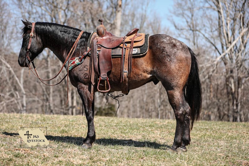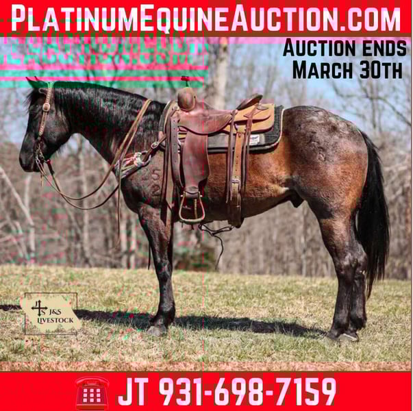 ONLINE AUCTION Place your bids at www.PlatinumEquineAuction.com Starting Bid $3500 Auction ends March 30th, 2025 Need a new saddle? Check out White Rock Saddles on our website or Facebook! PR BUCKS BLUE DRIFT… better known as B.B. around our place- is one of the nicest, and most willing ranch horse geldings we have ever had the pleasure of using. B.B is a true blue roan AQHA gelding standing 15.1 and is built like a using horse should be. He has been used out in the pasture catching, doctoring and loading cattle for a living, along with halter-breaking colts, riding fences, trail riding and everything in between. He truly is a versatile gelding around our place and will always get the job done for you. He is a gelding that will last you all day on the job and give you his all every step along the way. B.B. knows his job and is ready to go to work at any given moment. He is one hand broke, side passes with ease, will work the gates, hold the holes and stay ground tied all day. You won’t find much that phases this gelding. He is truly as user friendly for anyone wanting a ranch horse as they come. B.B. is not an (in your pocket) type gelding, however, even though he may not be looking to be someone’s next pet, don’t let the heart this horse has fool you. Not only does he have the grit and dedication to get any job you need done about the ranch, but the mindset it takes to get the job done correctly. So if you’re looking for a true handy, ranch gelding to go out and get the job done and look flashy while doing it, then B.B. might just fit into your herd. If you have any questions, would like to make a Buy It Now Offer or set up a Facetime Call, contact J & S Livestock JT 931-698-7159 Located in Santa Fe, TN. ONLINE AUCTION Place your bids at www.PlatinumEquineAuction.com Starting Bid $3500 Auction ends March 30th, 2025 Need a new saddle? Check out White Rock Saddles on our website or Facebook!