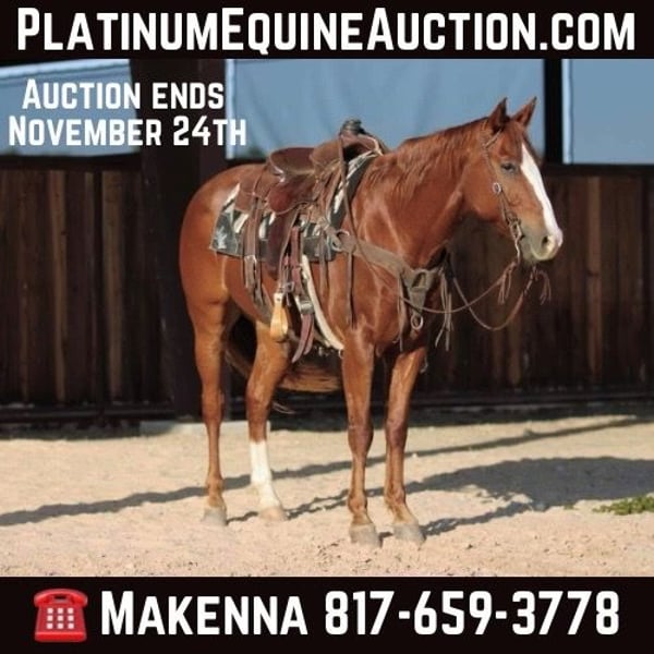 ONLINE AUCTION Place your bids at www.PlatinumEquineAuction.com Starting Bid $3500 Auction ends November 24th, 2024 Need a new saddle? Check out White Rock Saddles on our website or Facebook! Everyone needs a Lane in their life! He’s a plain old sorrel but has all the chrome you could ask for. If you’re looking for a family horse, or a nice ranch/trail horse, Lane is your man! Lane stands 15.2hh tall, at just 7 years old, he has a whole lifetime of fun to offer your family. This is the kind of horse everyone waits a long time to find, he is gentle as they come with a very kind eye. Lane is handy, one hand broke, moves off leg pressure and knows his leads as well. He would excel in the show ring but also is great outside on the trails! Lane crosses and goes through water like a seasoned pro, he climbs up and down anything you point him too. He does not mind rocky terrain and will go all day long. This horse has no spook to him, what’s so ever, NOTHING phases him. Lane will keep you and your loved ones safe no matter what, he rides alone or in a group, never buddy sour or barn sour. We have started Lane on the head side and he is taking right to it, slowly starting to come out of the box. We’ve also roped and doctored plenty outside on this gelding, never a bobble, he will let you get the job done alone as well. Lane may be wrapped in a boring color but you can’t afford to look past this gelding! Our ranch is located in Lipan TX We can help arrange shipping with the best haulers in the country to get Lane safety right to your door! Please call or text Makenna Hartzel 817-659-3778 for more information. ONLINE AUCTION Place your bids at www.PlatinumEquineAuction.com Starting Bid $3500 Auction ends November 24th, 2024 Need a new saddle? Check out White Rock Saddles on our website or Facebook!