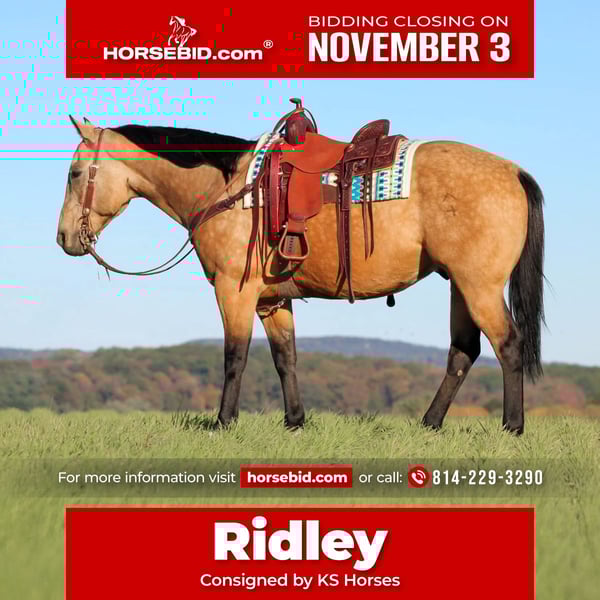 ⚜️𝐓𝐇𝐄 𝐅𝐀𝐋𝐋 𝐇𝐄𝐑𝐈𝐓𝐀𝐆𝐄 𝐂𝐋𝐀𝐒𝐒𝐈𝐂⚜️ Happening now thru MONDAY | NOVEMBER 3rd - Available EXCLUSIVELY on HorseBid's website! For more details and to register visit: www.Horsebid.com CONSIGNOR CONTACT: KS Horses 814-229-3290 LOCATION: Clarion, PA BREED: QH REGISTERED: No COLOR: Buckskin HEIGHT: 15.2 AGE: 8 GENDER: Gelding Ridley is a 8 Year Old Buckskin Quarter Horse Gelding. Standing 15.2 hands tall and has a nice stocky built to him. If you been looking for that All Around Good Broke Safe Gelding That Can Do Any Job From Family Trail Horse, Ranch Horse and Arena Horse then here he is. Ridley was raised on a cattle ranch and has done all aspects of ranch work from working cattle, dragging calves to the branding fire, to roping and doctoring cattle. Hes super experienced and well seasoned when it comes to working on the ranch and any kind of cattle work. We personally have been using him as a family trail horse. Putting friends on him when we go trail riding because hes so quiet and gentle. If your a timid rider he will help you gain your confidence. You can carry the flag on him the teddy bear on him. You can do all the dumb stuff on him and nothing phases him or bothers him. He also rides nicely in the arena and has a nice head set, good trot and smooth lope. Would make a nice lesson horse. He would also make a good husband type horse. You will love his nice easy neck rein, good stop and side pass and smooth trot and lope. Easy to catch and loves attention. He meets you at the gate. Good for the vet and farrier. He just recently has a Health and Lameness Exam done by a vet and he passed everything. We can help arrange delivery anywhere in the United States. Call or Text Kris at 814-229-3290. Thank You and God Bless