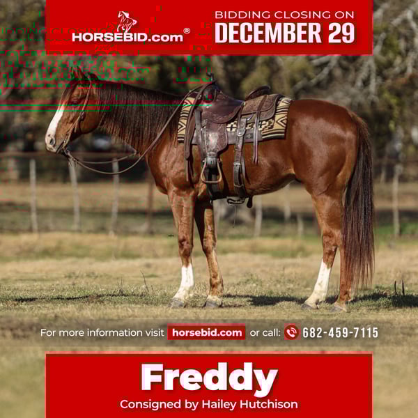 ⚜️ 𝓗𝓮𝓻𝓲𝓽𝓪𝓰𝓮 𝐖𝐢𝐧𝐭𝐞𝐫 𝓒𝓵𝓪𝓼𝓼𝓲𝓬⚜️ Happening now thru MONDAY | DECEMBER 29th - Available EXCLUSIVELY on HorseBid's website! For more details and to register visit: www.Horsebid.com CONSIGNOR CONTACT: Hailey Hutchison 682-459-7115 LOCATION: Joshua, TX BREED: Quarter Horse REGISTERED: Yes REGISTERED NAME: WW LIGHTS OUT COLOR: Chestnut HEIGHT: 15.3 AGE: 8 GENDER: Gelding WW Lights Out aka Freddy stands 15.3 hands tall, handsome chestnut gelding, that will be a perfect addition to the family!🏠♥️ Freddy will steal your heart with his sweet personality, he truly loves people!!! Easy to catch, stands tied, gets along with other horses, and a simple uncomplicated ride for anyone! Puppy dog gentle, kind disposition, and honest every single day. WTL steady circles in the arena, neck reins, picks up both leads, and always aims to please. Freddy has cruised the streets of downtown, and been to the drive thru Christmas light show, and is traffic safe. Enjoys going out on the trails, over logs, and even moving cattle/horses around. Also, rides really well English, and would excel in a lesson program. Goes over ground poles, started over small jumps, and progress every time! Freddy is willing to do whatever is asked of him, while remaining calm and relaxed. He has been ridden by ages from 4 to 54, safe for any level!! If you’re looking for a solid, saintly, and friendly horse, Freddy is your guy!🥰 Currently up to date on coggins, deworming, farrier, and dental. Sells 100% safe and sound! Happy to help arrange shipping to any location!