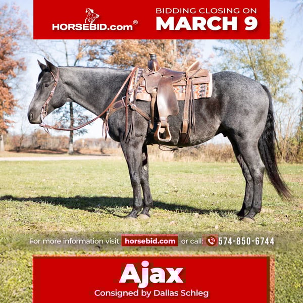 ℳ𝒶𝓇𝒸𝒽 ♦️𝐑𝐈𝐃𝐄𝐑'𝐒 𝐂𝐇𝐎𝐈𝐂𝐄♦️ Happening now thru MONDAY | MARCH 9th - Available EXCLUSIVELY on HorseBid's website! For more details and to register visit: www.Horsebid.com CONSIGNOR CONTACT: Dallas Schleg 574-850-6744 LOCATION: North Judson, IN BREED: AQHA REGISTERED: Yes REGISTERED NAME: FIRE BREATH N DASH COLOR: Blue roan HEIGHT: 15.3 AGE: 9 GENDER: Gelding Ajax (FIRE BREATH N DASH) is a 2017 AQHA gelding. He stands 15.3 and is 1250 +! His size does not diminish his movement however and Ajax has an amazing handle to go with his stunning appearance! Ajax has been hauled all over to rodeos, trail riding, clinics, and play days! He has a decent turn around, a good side pass, lopes out of his tracks in either lead, And not a bad lead change either! He is formally trained to run barrels, but do not think he is some fire breathing dragon that is uncontrollable or sour. He is level headed and BROKE! We’ve used Ajax to pony colts, turn back buffalo, and rope cows! He crosses water, bridges, and logs with confidence. Ajax also loads, bathes, ties, and is good for the farrier! He is %100 sound and is currently barefoot. If you have any more questions or would like to come check him out in person do not hesitate to call me at 5748506744 for more questions!