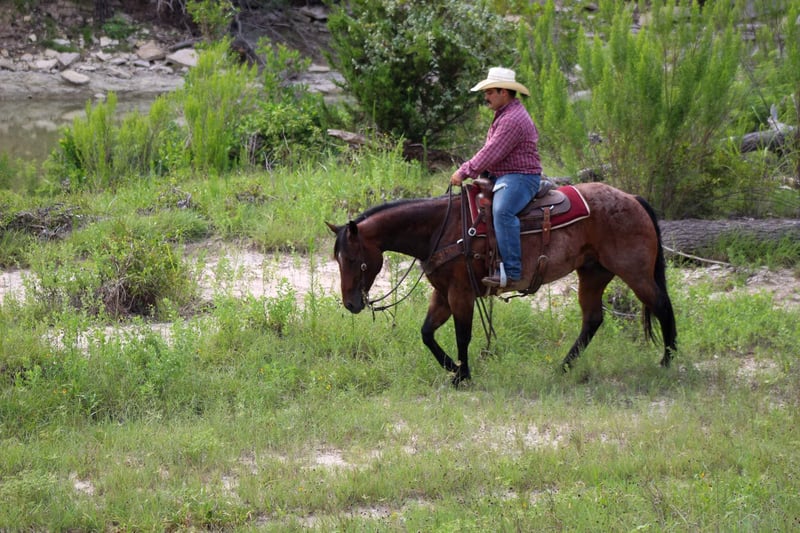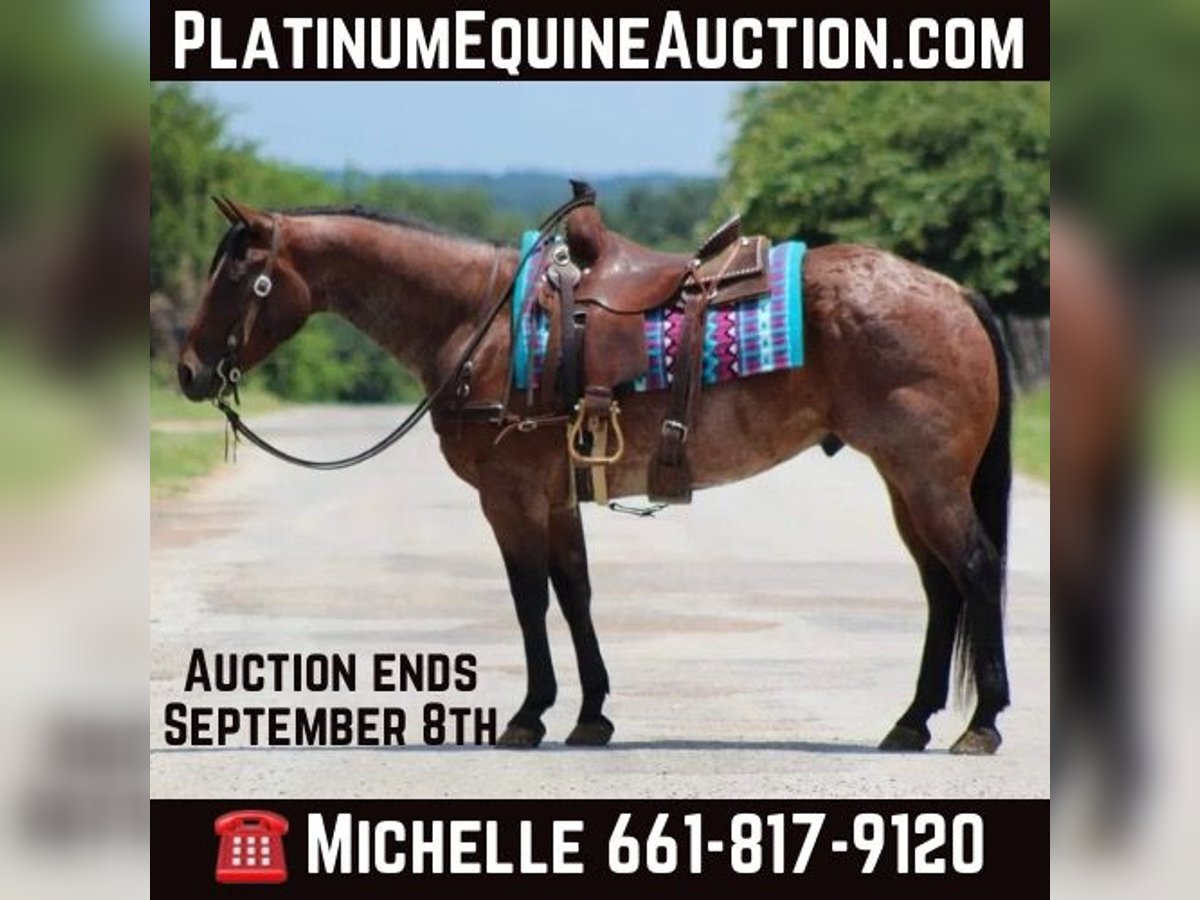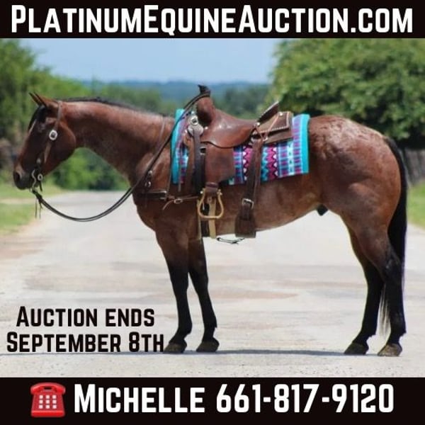 ONLINE AUCTION Place your bids at www.PlatinumEquineAuction.com Starting Bid $3500 Auction ends September 8th, 2024 Need a new saddle? Check out White Rock Saddles on our website or Facebook! Pablo is a stunning 7 year old bay roan gelding standing 14.3 hds tall and as wide as a mac truck ! He has an old soul demeanor to him and acts like a seasoned veteran wherever you take nothing bothers him and I mean nothing! He has been on several trail rides and hunting trips in the Rocky Mountains. He can go up and down any mountain and is sure footed . He always rides low headed and never raises his head above the saddle horn just like one should . He has been rode down the historic Forth Worth Stockyards and handled all the commotion, crowds of people , and traffic like a seasoned pro . He has zero spook to him and would ride to war if you asked him to. He is a blast to ride down the trail , he is confident and goes wherever you point him up and down hills, crosses water, bridges, logs and tarps with zero issues. He has seen many wildlife out on his adventures. In the arena he will walk , trot and lope circles with a great stop ! The great thing about him you don’t have to be a cowboy to ride as long as you can sit up there and hold the reins you can ride him wherever you want . From the trails to checking your herd of cattle he’s the one for the job . Pablo has a bright future of him and someone is going to enjoy him for many years to come . He is a barn favorite and I just know at his next home he’s gonna be the favorite also . He is the first one to meet you at the gate , he stands tied , easy to tack up and bridle , stands for the farrier, baths, loads and unloads like the perfect gentleman he is. Keep him in a stall or a pasture he doesn’t care. He is currently turned out with two other geldings . Hes got a ton of personality and in your pocket !Contact us to come try him or we can set up a FaceTime also. If you need help with transport don’t hesitate to ask we have a list of reputable haulers that can get him safely to your doorstep world wide. Located in Stephenville, TX. Contact M$ Performance Horses Michelle 661-817-9120. ONLINE AUCTION Place your bids at www.PlatinumEquineAuction.com Starting Bid $3500 Auction ends September 8th, 2024 Need a new saddle? Check out White Rock Saddles on our website or Facebook!