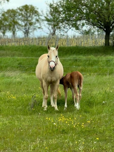 Balanced and relaxed broodmare for sale – a lovable partner also suitable as a leisure horse! The mare is currently kept in a paddock with turnout in a small herd. As a broodmare, she impresses with trouble-free pregnancies and uncomplicated foalings. In handling, she is calm and composed, both with children and adults. She has been backed, moves in all gaits, and proves to be a reliable leisure horse for trail riding.
