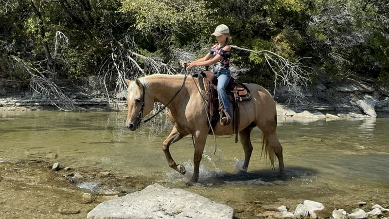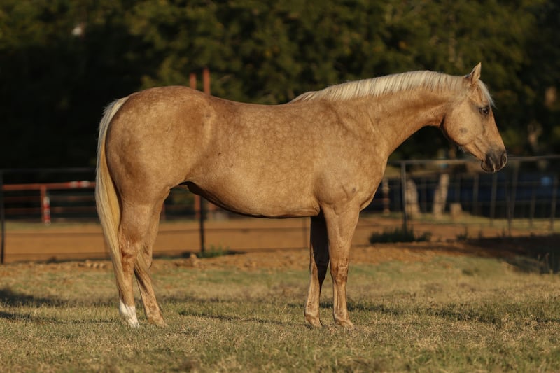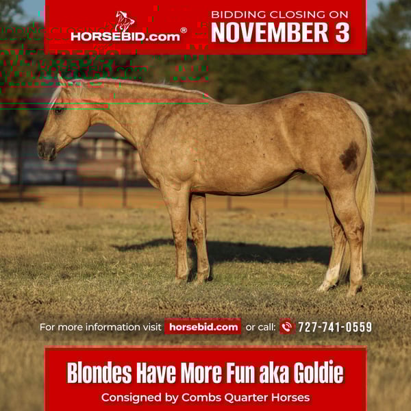 ⚜️𝐓𝐇𝐄 𝐅𝐀𝐋𝐋 𝐇𝐄𝐑𝐈𝐓𝐀𝐆𝐄 𝐂𝐋𝐀𝐒𝐒𝐈𝐂⚜️ Happening now thru MONDAY | NOVEMBER 3rd - Available EXCLUSIVELY on HorseBid's website! For more details and to register visit: www.Horsebid.com CONSIGNOR CONTACT: Combs Quarter Horses 727-741-0559 LOCATION: Cleburne, TX BREED: Quarter Horse REGISTERED: No REGISTERED NAME: Goldie COLOR: Palomino HEIGHT: 15 AGE: 12 GENDER: Mare If you’ve come to find the prettiest family trail horse.. Goldie is the one for you! 12yr old mare standing a stocky 15h tall. Goldie is the prettiest dark golden palomino mare you can find with the absolute best in your pocket disposition. This is a super comfortable mare to ride with the easiest go with the flow type of personality. Goldie has been used in an English lesson barn teaching the “up down” lessons, she’s packed the kiddos around the smaller jumps, she’s been shown successfully in the lower hunters and jumpers, and shes the best trail horse you could ask for! Nothing bothers her! She doesn’t mind the wildlife, dogs or water. She goes up and down the big hills with ease, she’s careful on the rocks and she’s a blast to gallop along the open areas! She will ride out alone or anywhere in the group. She will also let you pony off of her without trouble. Goldie doesn’t get hot or excited. She will go just the speed you ask of her with a great one hand neck rein, an easy stop and a nice low headset. This girl is an easy keeper that can sit for long periods between rides without issues. From the kiddos to the seniors.. you’re sure to love riding and loving this super sweet mare!! Goldie is sound with no maintenance. Super easy keeper. She is currently eating free choice alfalfa and 1/2 scoop of a basic pellets once a day. Goldie is easy to catch and quiet in a mixed herd setting. Not a bossy mare by any means. Super easy to load and haul. Stands tied to the trailer like a lady. Exceptional ground manners. Even the little ones can lead her around. No bad habits, no vices, no buck, rear bite or bolt. Goldie will ride any anything from a halter to a French link snaffle. She’s not picky or fussy.