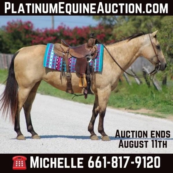 ONLINE AUCTION Place your bids at www.PlatinumEquineAuction.com Starting Bid $3500 Auction ends August 11th, 2024 Need a new saddle? Check out White Rock Saddles on our website or Facebook! They don’t come anymore perfect than this pretty little gal we’re about to Introduce you to ! Butters is a 12 year old buckskin mare standing 14 hds tall . Shes absolutely SAFE for any level rider and will be safe for anyone from 5 to 85 . We trust Butters with everyone ! Butters is the funniest gal to go cruise around on , she’s user friendly and you don’t have to be a cowboy to ride her . She is happy to do whatever you ask of her , she will go out down the trail by herself or in a group . She will cross water , logs , bridges and tarps and whatever else you may come across down the trail with zero hesitation. She is confident all while taking care of her riders . She is the perfect mount for everyone including the littles to enjoy from the trails to arena work . Butters is always a trooper when being rode in town with the heavy traffic , crowds of people and is always the first one to get loved on by everyone . She is the sweetest mare and loves attention always being the first one to greet you in the barn . In the arena she has smooth gaits and transitions . We have gave numerous lessons on her for all levels of riders , she is very forgiving and always try’s 100% to please. She will walk , trot and lope circles , she has a true neck rein on her , moves off of your legs. She is the perfect addition to anyone’s family and not only is she the perfect size she’s Americas favorite color ! She loads and unloads off the trailer great . Stands great to tack up and easy to bridle . Butters is also one you can jump on bareback with a halter and take out for a ride . She clips , ties , stands for the farrier and bathes like a dream. She is truly a unicorn that everyone searches the world for! Call us to schedule a time to come try her out or we can set up a FaceTime call. If you need help with transport don’t hesitate to ask we have a list of reputable haulers that can get her safely to your doorstep world wide. Contact M$ Perf. Horses Michelle 661-817-9120 with any questions. Located in Stephenville, TX. ONLINE AUCTION Place your bids at www.PlatinumEquineAuction.com Starting Bid $3500 Auction ends August 11th, 2024 Need a new saddle? Check out White Rock Saddles on our website or Facebook!