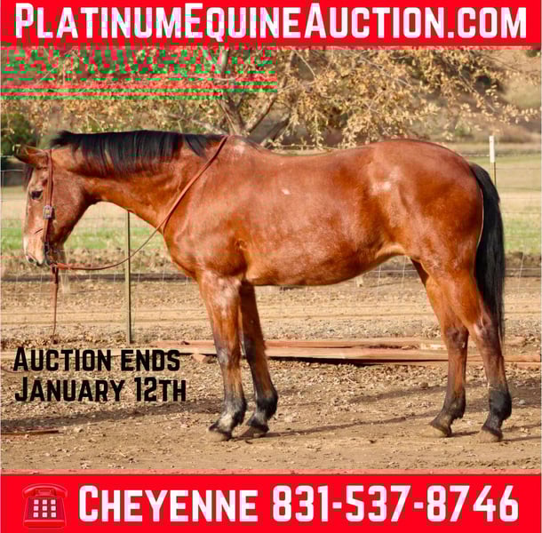 ONLINE AUCTION Place your bids at www.PlatinumEquineAuction.com Starting Bid $3500 Auction ends January 12th, 2024 Need a new saddle? Check out White Rock Saddles on our website or Facebook! Minnie is a 13 year old, 14.3HH grade roan Appaloosa mare. This little lady is the epitome of a true beginner horse! Laid back, patient, kind and most of all safe for toddlers to your great grandmother! No horse experience is needed to get along with her! Minnie has more whoa than go, but will travel out anywhere you go with a laid back stride. She has the sweetest little pony lope that is slow, steady and the easiest to sit. You can steer her with your pinky finger on the rein, she’s that light and broke. WTL with no bridle, stop at the word “whoa” and reverse with the slightest pressure. She will walk for miles with her head low and on a loose rein. She never gets startled, and is never in a hurry. Minnie is as experienced as a trail horse as you’ll ever find and is adaptable to every situation. Crosses water, bridges and anything else of the sort without hesitation. Never gets buddy or barn sour, and you can trust she will take care of beginner riders. We have done trail competition course like a pro, carried flags, rode in town, and out in the forests, still no one is better behaved than Minnie. Yes, I know you’ve probably convinced yourself you don’t want a mare, but Minnie isn’t not a normal mare and you will change your perspective on mares, she has zero attitude, no mood swings and gets along with every horse she has ever been with. If you didn’t know she was a mare, you would have thought she’s a gelding! Minnie is an excellent choice for first time horse owners, to teach them the ropes, or a confidence builder for anyone wanting to just get back to the love of riding again! Minnie has zero problems, and is ready to take on a forever home with a new family! She is located in Bitterwater, CA. for more information please contact Cheyenne Rey 831-537-8746. ONLINE AUCTION Place your bids at www.PlatinumEquineAuction.com Starting Bid $3500 Auction ends January 12th, 2024 Need a new saddle? Check out White Rock Saddles on our website or Facebook!