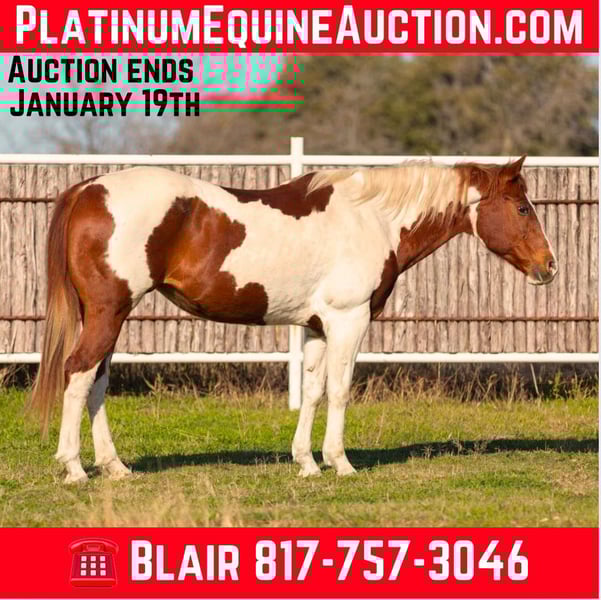 ONLINE AUCTION Place your bids at www.PlatinumEquineAuction.com Starting Bid $3500 Auction ends January 19th, 2025 Need a new saddle? Check out White Rock Saddles on our website or Facebook! Missy is the perfect sized 15H, 14 yr old sorrel and white paint mare. She has been THERE done THAT!! The majority of her life she’s been used a parade / drill team / flag horse and she’s even carried sparkling firecrackers! When not at an event, she was used as the beginner riders trail horse and she has seen COUNTLESS miles of trails! She is absolutely as gentle as one could be! Missy LOVES attention and has the sweetest NON marish personalities! She is very broke and rides like a good, honest one should!! She’ll neck rein and move off leg, short lope right off and stop right when you tell her to!! Missy has ZERO buck, bolt or rear and is not spooky at all! She would be the ideal horse for anyone looking for an unflappable trail horse or drill team/flag/parade horse! She is solid and SANE in every way and she’d be the perfect beginner horse or lesson horse too! If you can hold the reins, you can ride her! Missy is UTD on teeth, feet and coggins and ready to go to her new family! You’re absolutely sure to love this girl, she quickly became a barn favorite here!!! More pics and videos on her website page at northtexashorsecompany.com/missy. Please call Blair with North Texas Horse Company for more info at 817-757-3046. We are located in Weatherford, TX and can help arrange affordable shipping to anyone!! ONLINE AUCTION Place your bids at www.PlatinumEquineAuction.com Starting Bid $3500 Auction ends January 19th, 2025 Need a new saddle? Check out White Rock Saddles on our website or Facebook!