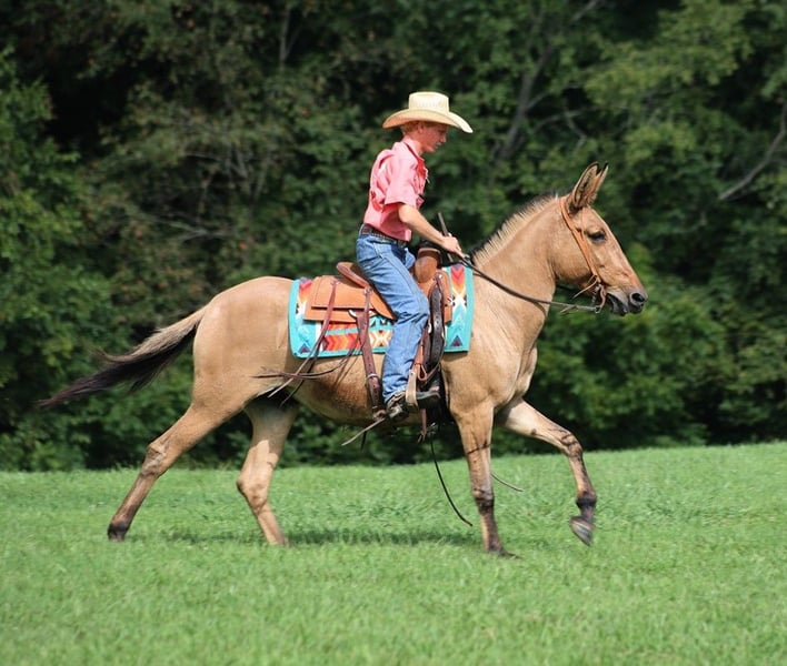 ONLINE AUCTION Place your bids at www.PlatinumEquineAuction.com Starting Bid $3500 Auction ends September 1st, 2024 Need a new saddle? Check out White Rock Saddles on our website or Facebook! Talk about a RARE find!!! Liddy is total eye candy but the best part about her is more than what meets the eye! Liddy is a 13 year old, Buckskin Molly(mare) Mule with dun stripes that is standing around 15.1H. Liddy has the color, the size, the mind and the rideability! Liddy is easy to handle, she tacks up quietly, is fine with her ears and feet as well. Liddy has been with me all since back in early spring and I have used her for trail riding and ranch work. She has been out on some cow catching jobs and handles herself with poise even in tense high stress situations. She has roped in the pasture, held the rope tight while I tied them down, drug cows on the trailer and stands her ground against mad ones. Out on the trails, Liddy is great and loves to go trail riding. She will cross obstacles and goes over any terrain. She has been exposed to all kinds of wildlife such as deer or turkey and will go anywhere that she is asked too. She will go up or down even the steepest slopes, across deep creeks, over downed trees, and over all types of rough terrain while still being sure footed. Liddy will lope nice circles, she takes her leads, stops and backs as well. She has been rode in traffic, and is very traffic safe around cars, semi, log, and dump trucks. She has a great attitude about whatever she is asked to do. Feel free to call Moore Trained Horses Logan 765-265-0033 any questions. Located in Level Green, KY. ONLINE AUCTION Place your bids at www.PlatinumEquineAuction.com Starting Bid $3500 Auction ends September 1st, 2024 Need a new saddle? Check out White Rock Saddles on our website or Facebook!