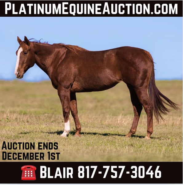 ONLINE AUCTION Place your bids at www.PlatinumEquineAuction.com Starting Bid $3500 Auction ends December 1st, 2024 Need a new saddle? Check out White Rock Saddles on our website or Facebook! Shining Chrome aka “Shimmer” is a 2010’ model 15.2H AQHA sorrel mare. If you’re looking for something absolutely SAFE for your grandma to trail ride but also want something you or the kids can go compete on, Shimmer is the perfect fit! She is absolutely puppy dog gentle and will take care of any level of rider! She has spent the last few years running barrels with a young girl and unfortunately life got in the way and she had to sell her due career changes. Shimmer is easy on the barrels and would be the perfect horse for a kid ready to step up or someone looking to just cruise and have fun! She’s as honest as they come and knows her job! We’ve struggled with how to represent this horse because she is an extremely laid back, gentle, sane, SOLID trail horse as well. You absolutely DO NOT need to run barrels to enjoy this horse! Don’t let the words “barrel horse” scare you! She is absolutely not hot or illy broke as some assume barrel horses are! Shimmer will take care of anyone, anywhere and do so willingly! She is one of the easiest horses we have ever had the pleasure to represent! She will pack a beginner or timid rider and take care of them every step! She’s not spooky in the slightest, has ZERO buck, bolt or rear and is truly one of the kindest horses you’ll find. She is handy broke and neck reins around perfect, moves off leg, switches gaits right when asked and stop as soon as you tell her to. Shimmer has one of the best personalities we’ve seen from a mare and she’s currently turned out in a herd of crabby mares and she never feeds in to the drama! Call her name or whistle and she runs straight to you! This mare deserves to go be someone’s heart horse whether that’s in the barrel pen or trails! While she likes running barrels, we feel Shimmer would be just as happy as a pleasure trail horse! In north Texas competition she’s a consistent 3/4D horse. Her previous owner did rodeo on her on the east coast and she has clocked in the 1/2D out that way! She runs in a snaffle and is EASY EASY EASY in the arena and out! She loads, hauls, leads bathes and ties great and has no major vices or quirks! Shimmer is UTD on teeth, feet, wormer, coggins and ready to go to her new home to be someone’s number one! More pics and videos on her website page at northtexashorsecompany.com/shimmer. Be sure to watch her stockyards/trail video AND her barrel video! Please call Blair with North Texas Horse Company for more info at 817-757-3046. We are located in Weatherford, TX and can help arrange affordable shipping to anyone!! ONLINE AUCTION Place your bids at www.PlatinumEquineAuction.com Starting Bid $3500 Auction ends December 1st, 2024 Need a new saddle? Check out White Rock Saddles on our website or Facebook!
