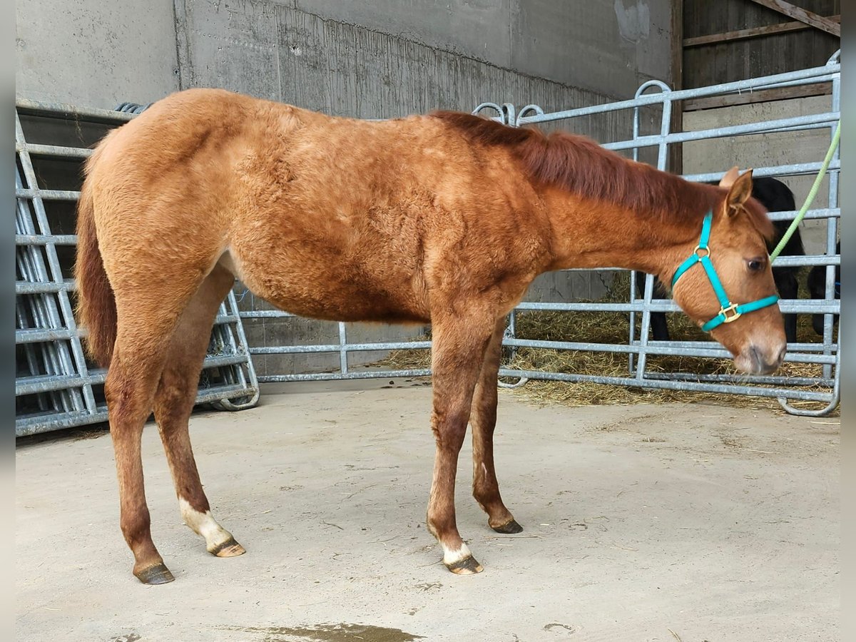 Sun O Lena Chexinic is a stunning Quarter Horse mare, born on July 20, 2025, with an estimated final height of approximately 15.0 hh. She is a red dun and homozygous dun, with AQHA papers available, and is registered with the DQHA. The mare impresses with her correct conformation, beautiful color, good development, and balanced muscle tone. She is healthy, regularly dewormed, and raised in a herd environment. She is familiar with veterinary care and farrier work. 5-panel genetic test is negative (n/n). She is halter broke and knows the basics of foaling management. Character-wise, she is very sweet, people-oriented, and easy to handle. She is responsive, possesses a great temperament, is highly athletic, eager to please, and learns quickly, making her an exciting prospect for future training. With her rare cutting pedigree in Europe, she is an excellent prospect for sport, competition, and breeding, and her potential as a cutting show horse should be developed later. She is a granddaughter of Doc O Lena and Bueno Chexinic. A young mare with exceptional quality, presence, and willingness to perform, making her highly interesting for both ambitious riders and breeders.